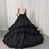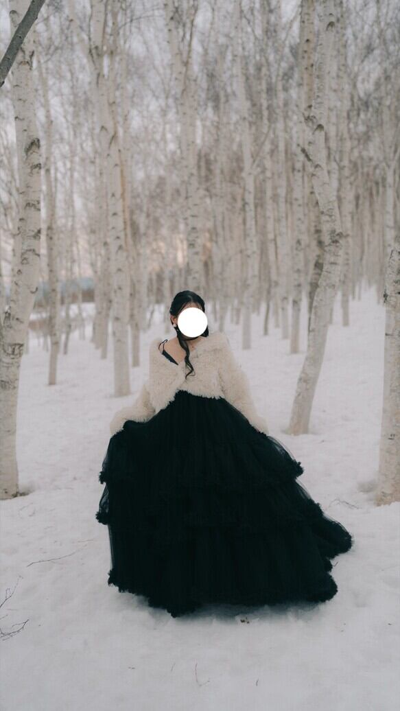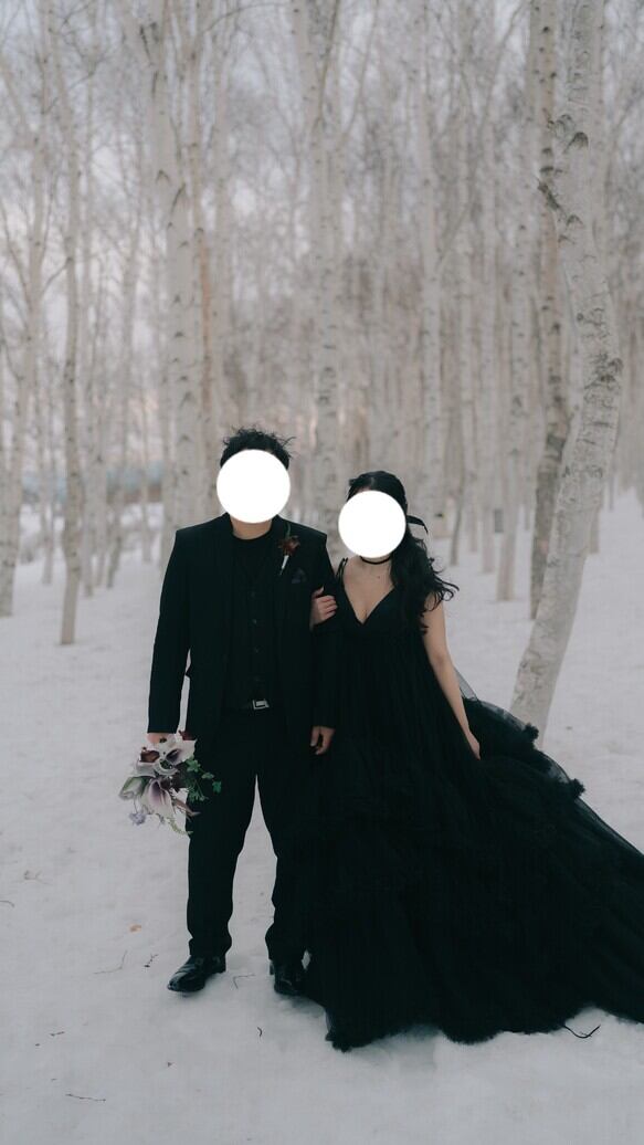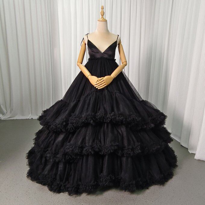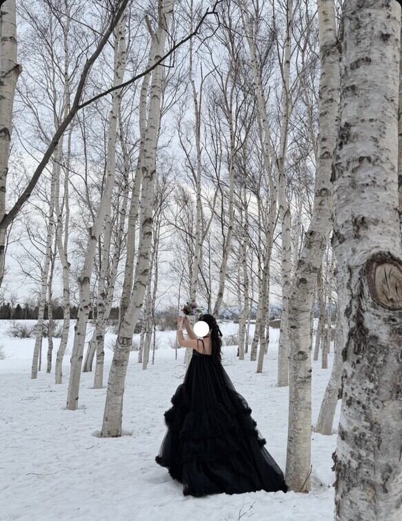 実例写真 黒 Vネック ボリュームドレス カラードレス韓国風ドレ もこもこフリルドレス柔らかく重ねたチュール 結婚式