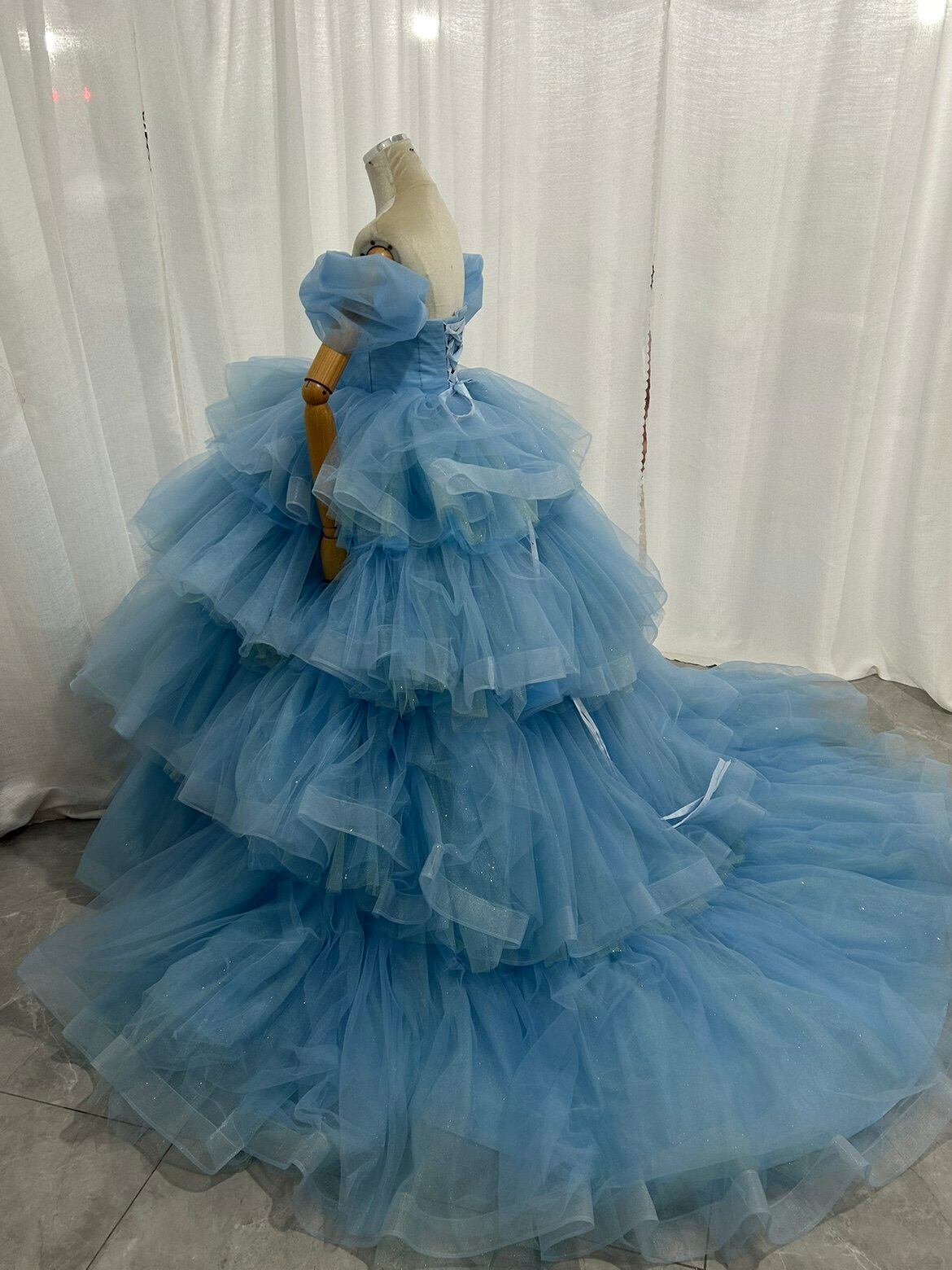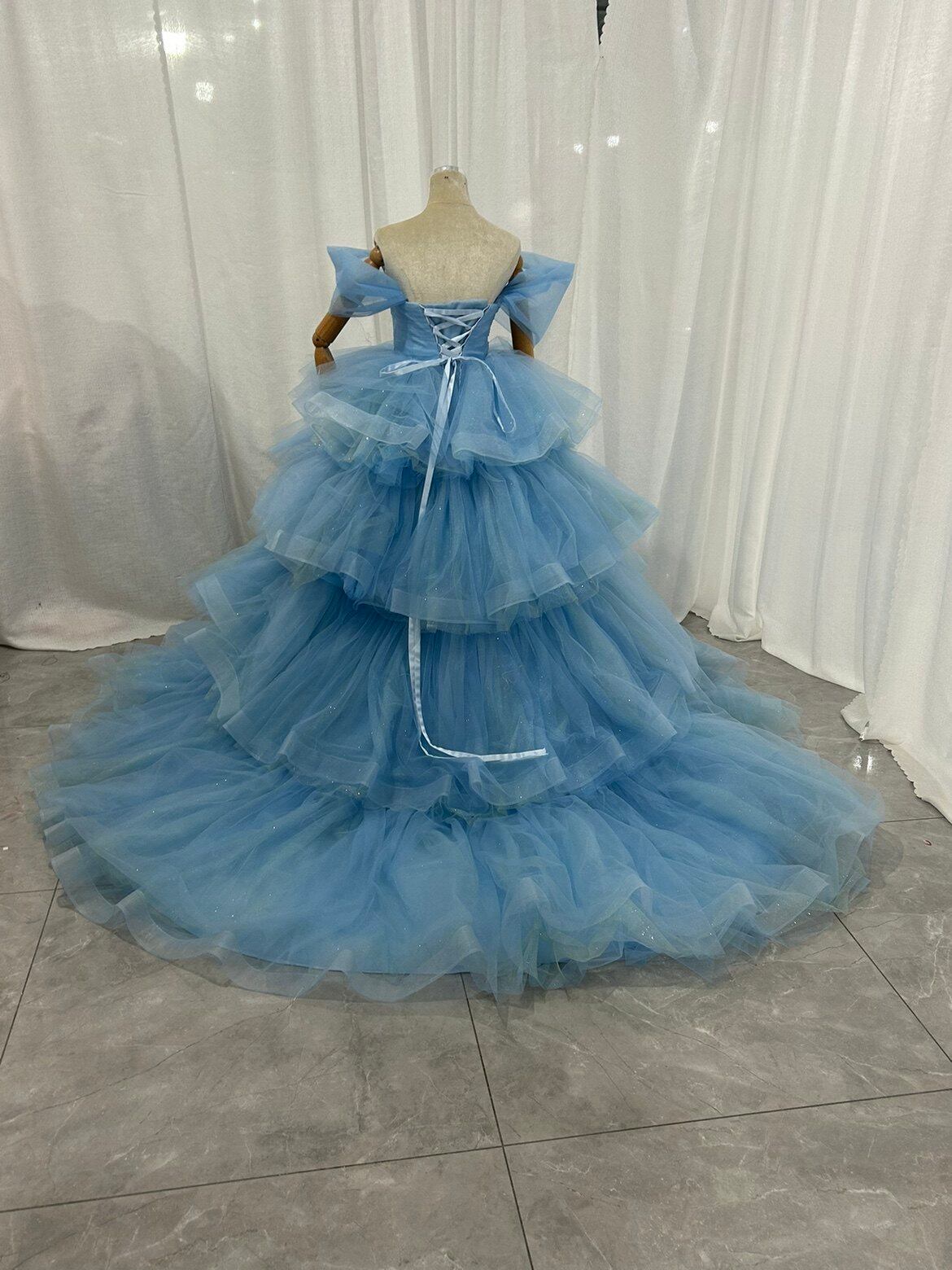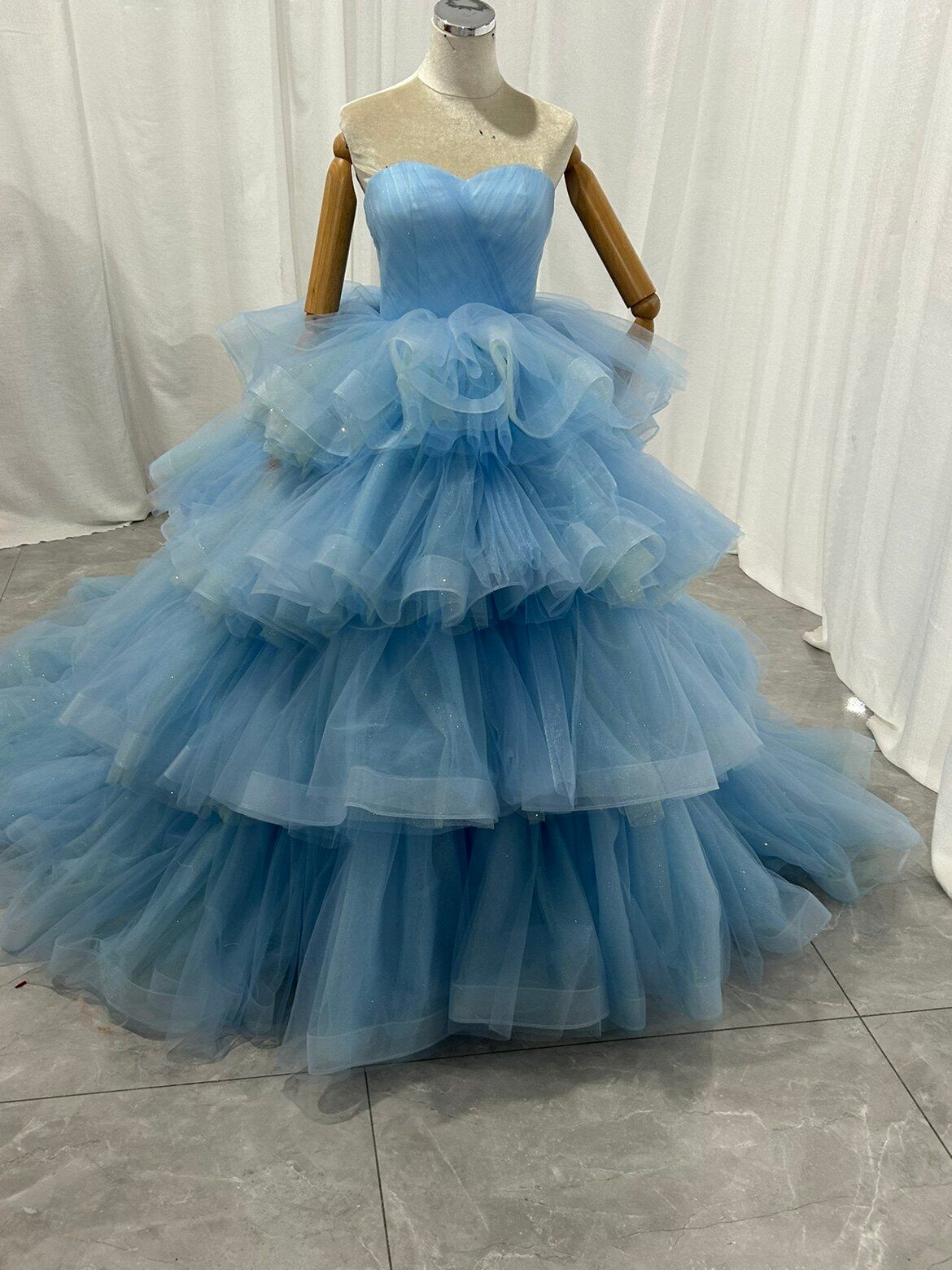 青 ボリュームドレス カラードレス韓国風ドレ もこもこフリルドレス柔らかく重ねたチュール ティアードのドレス結婚式