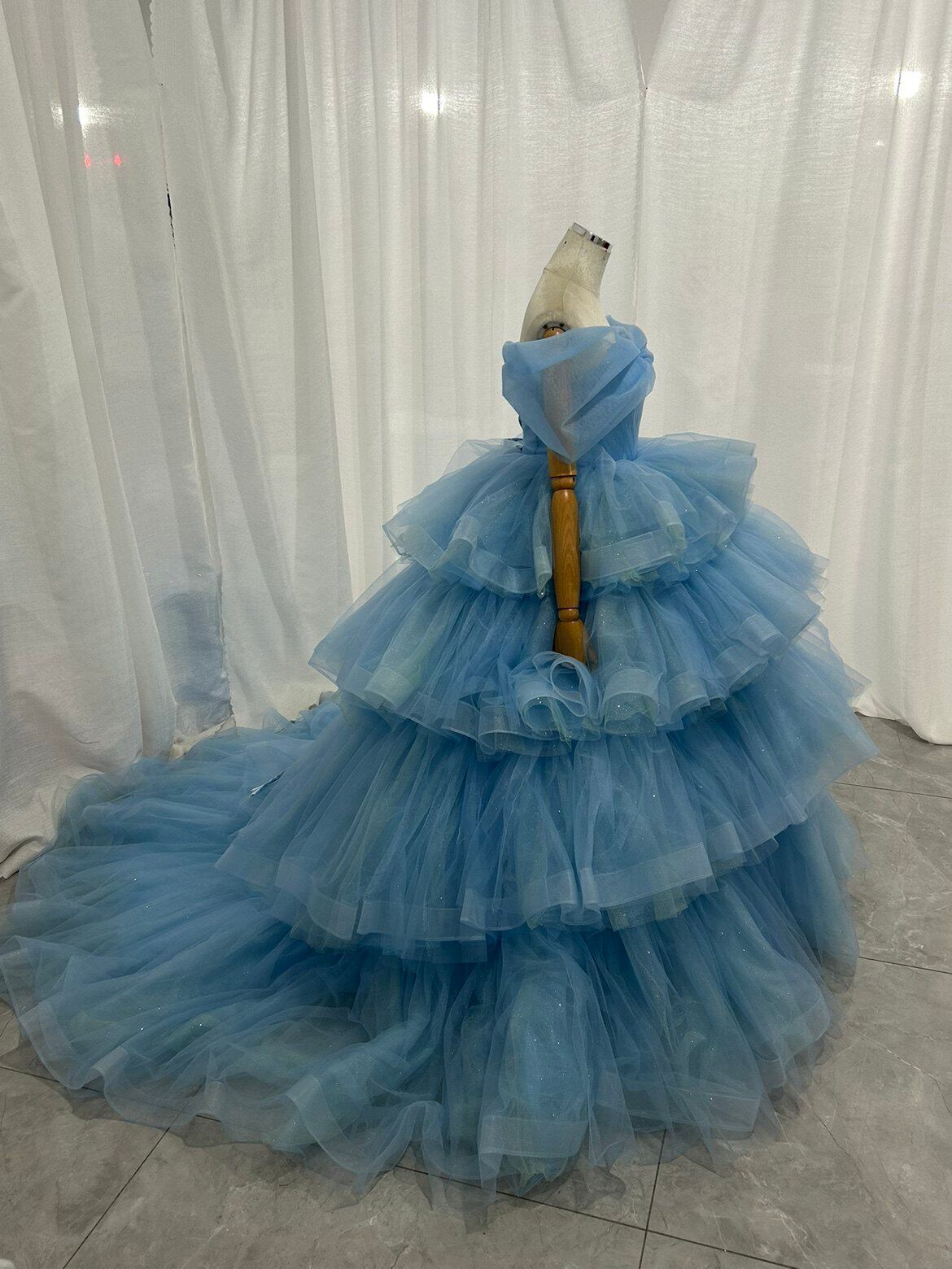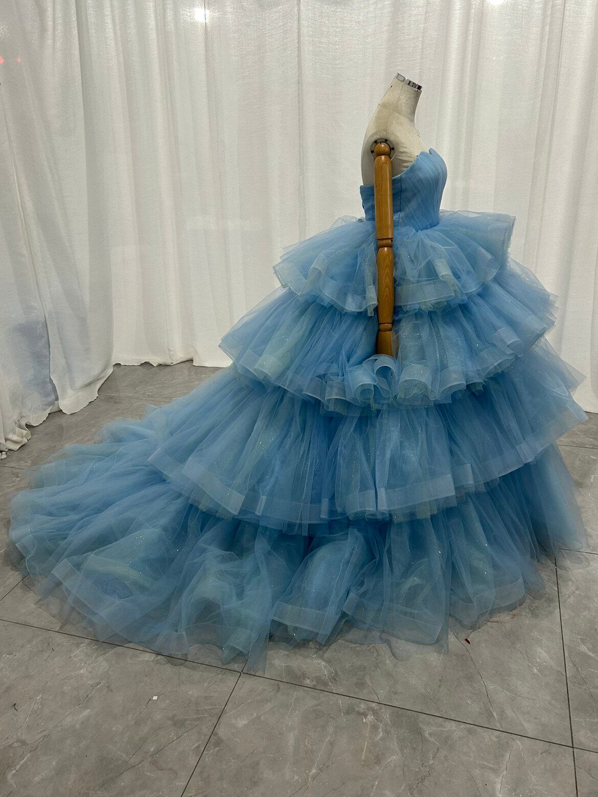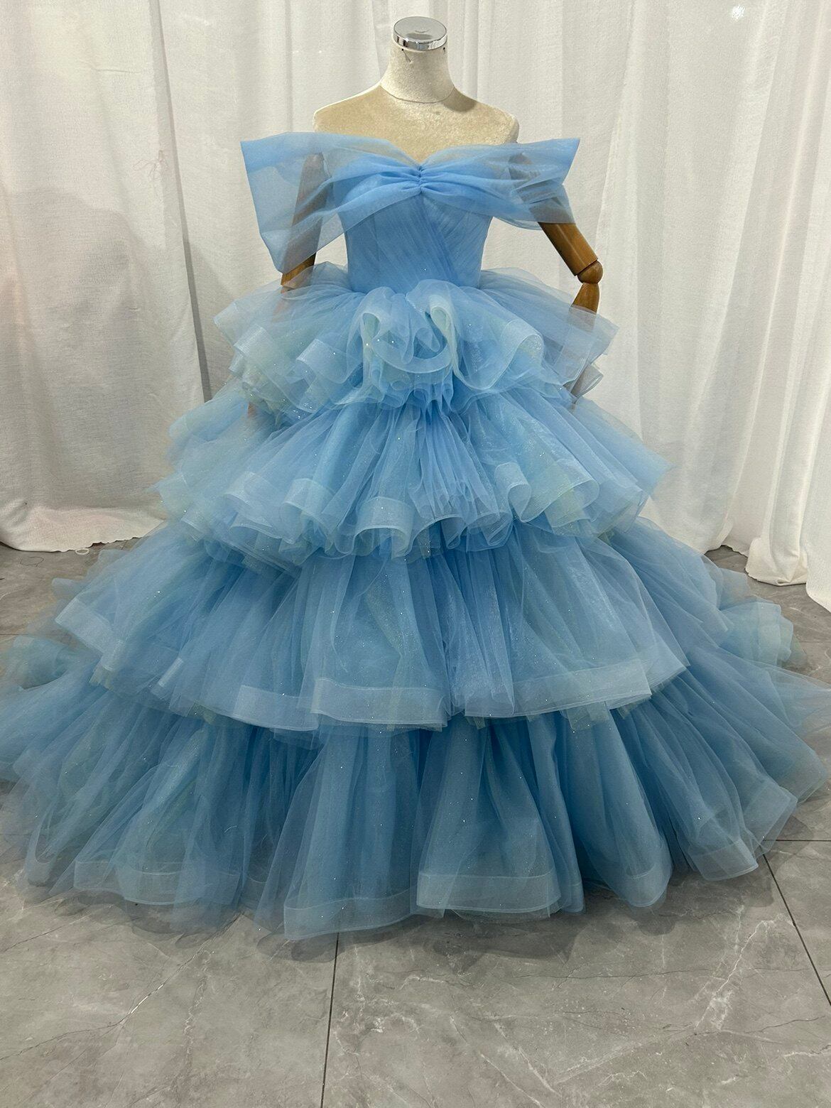 青 ボリュームドレス カラードレス韓国風ドレ もこもこフリルドレス柔らかく重ねたチュール ティアードのドレス結婚式