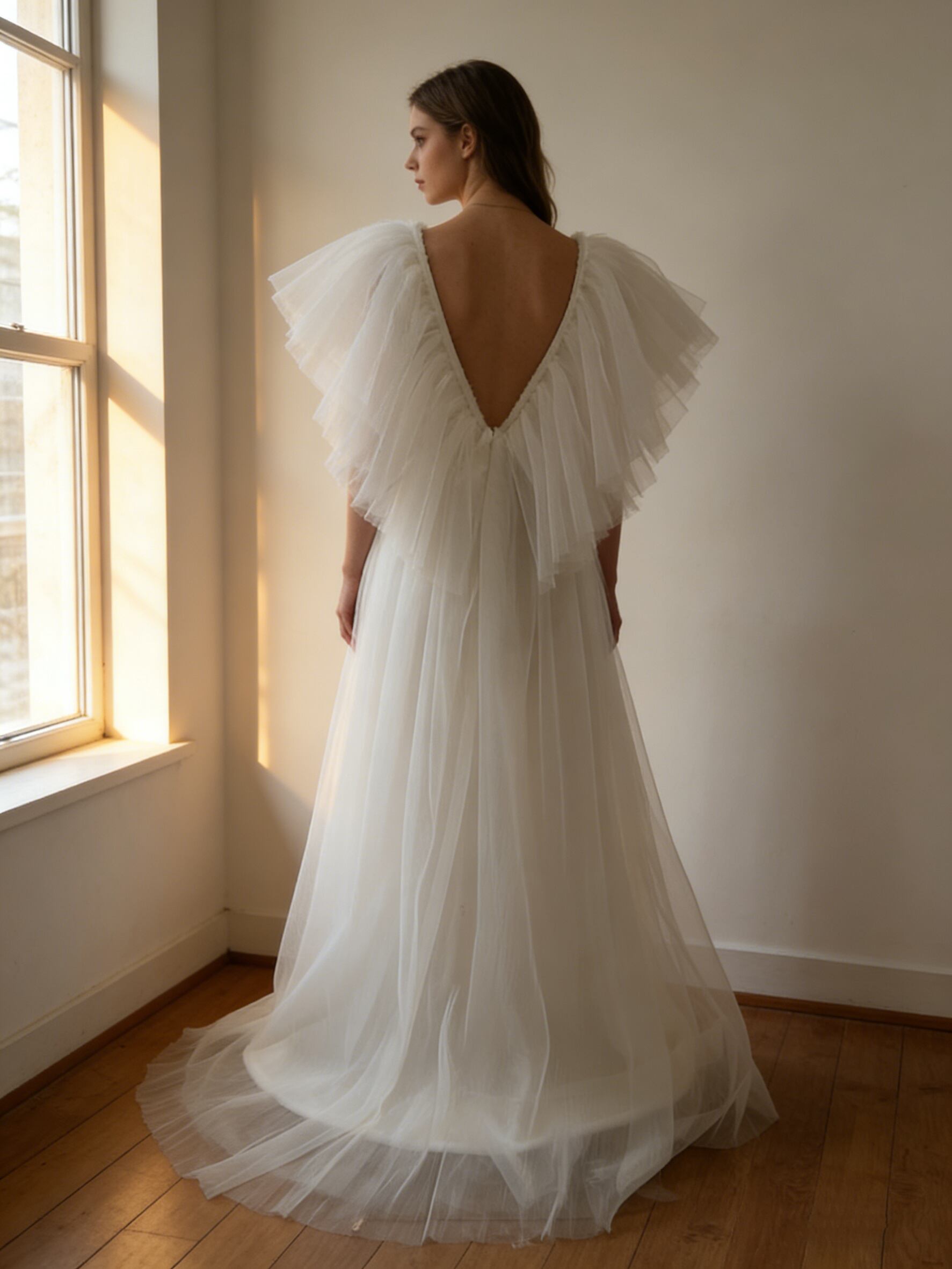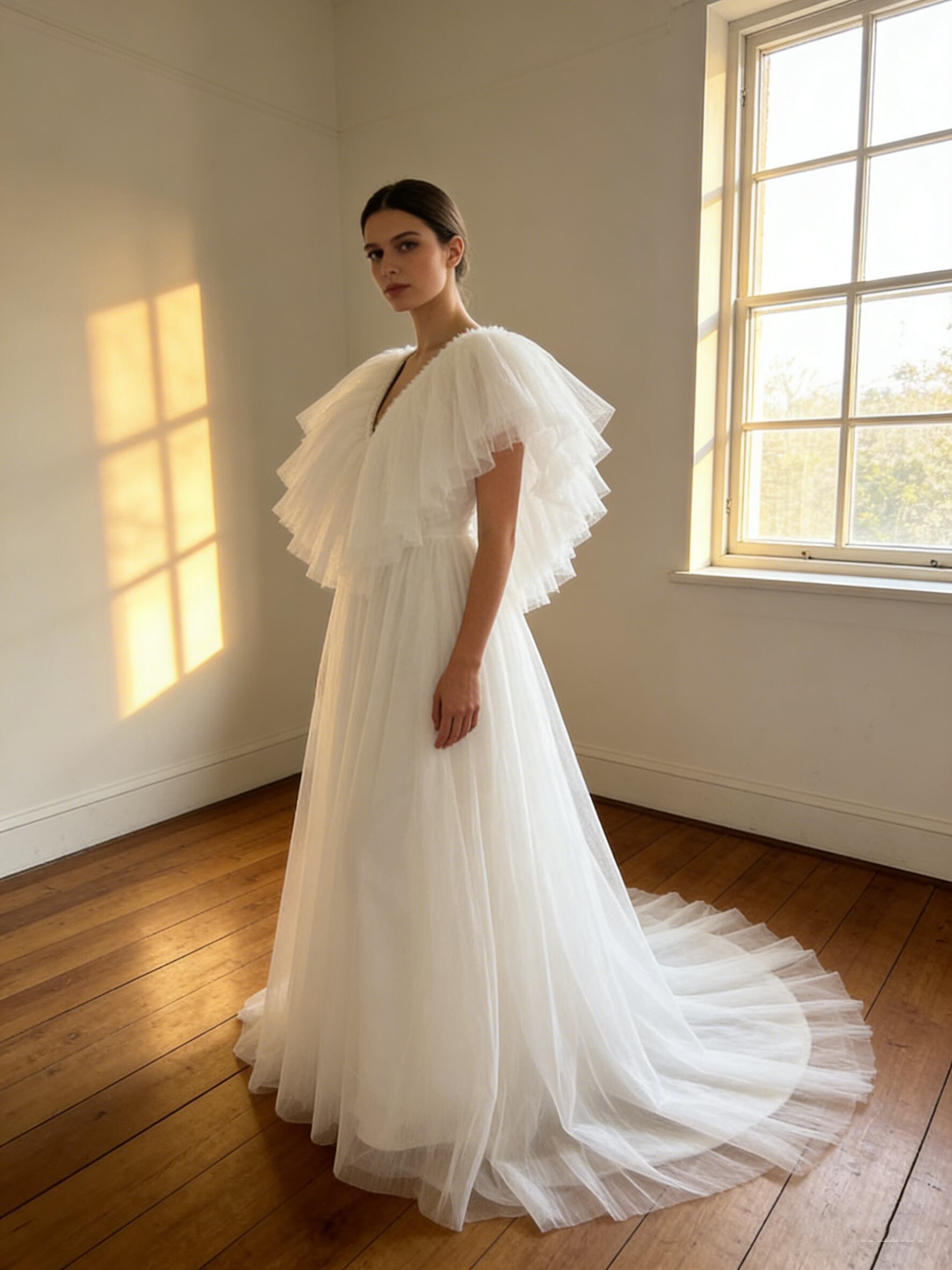 美品!ウエディングドレス Vネック ソフトチュール /短トレーン 結婚式/披露宴