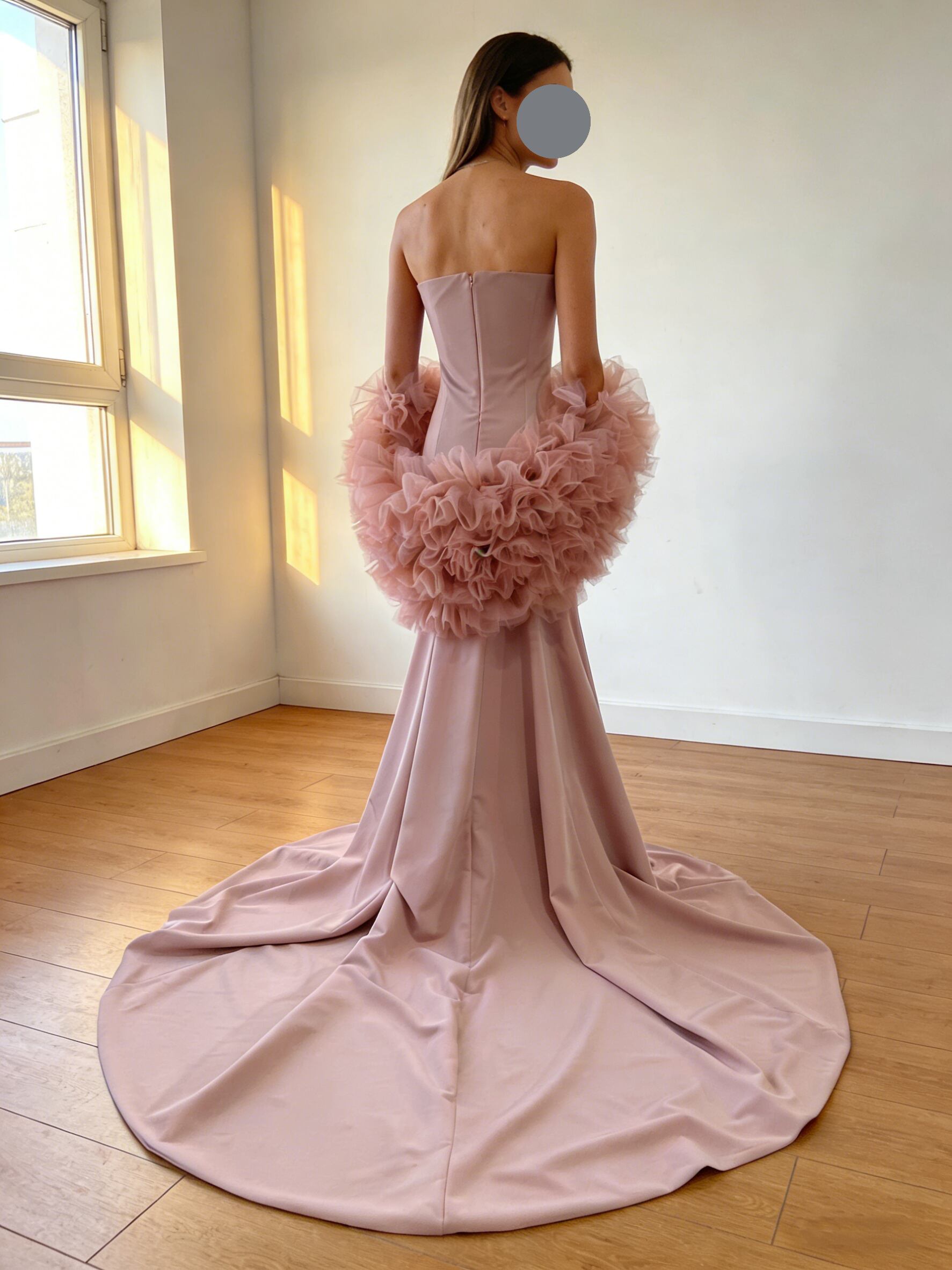 上品 ピンク カラードレス ソフトマーメイドライン パフスリーブ + ソフトチュール ポンチョ結婚式/披露宴/前撮り
