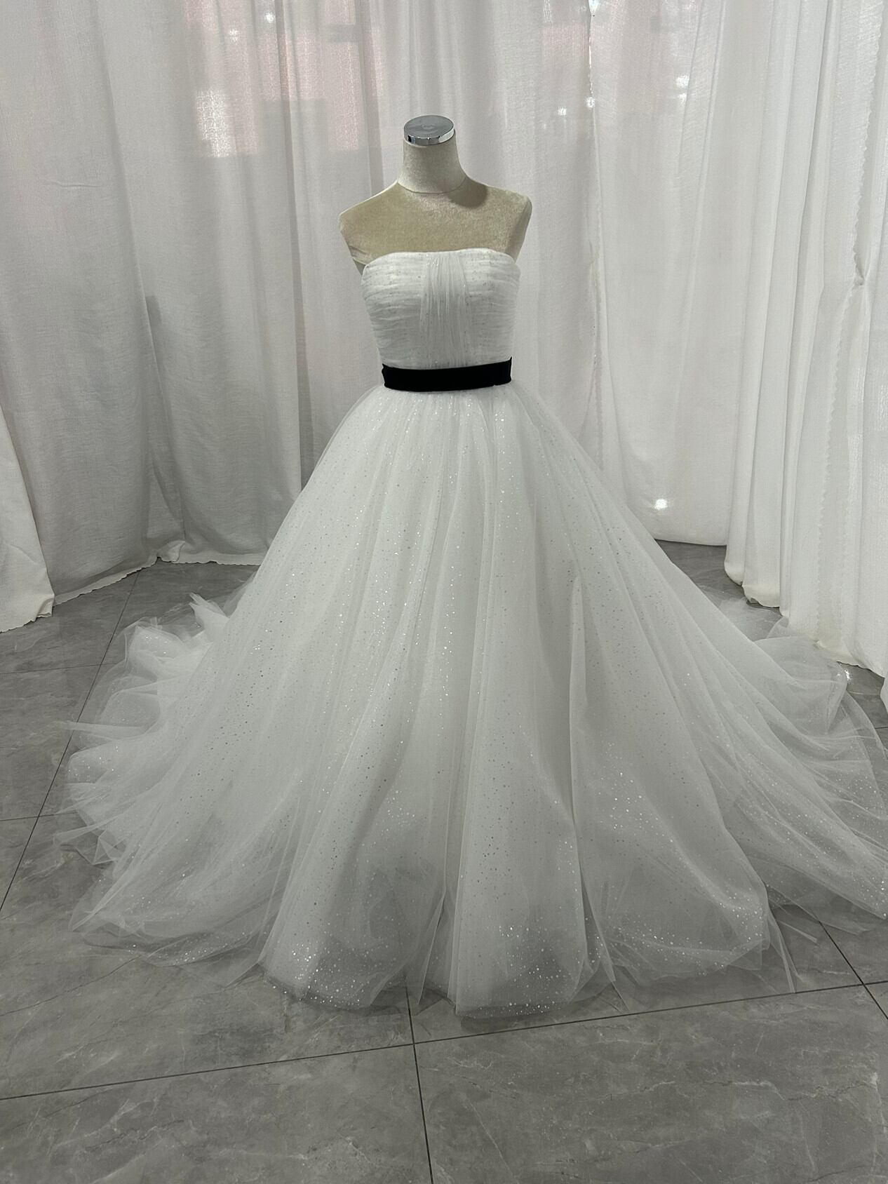 輝きな光彩を放つ オフホワイト 取り外しオフショルダー キラキラグリッターチュールウエディング 華やかなトレーン