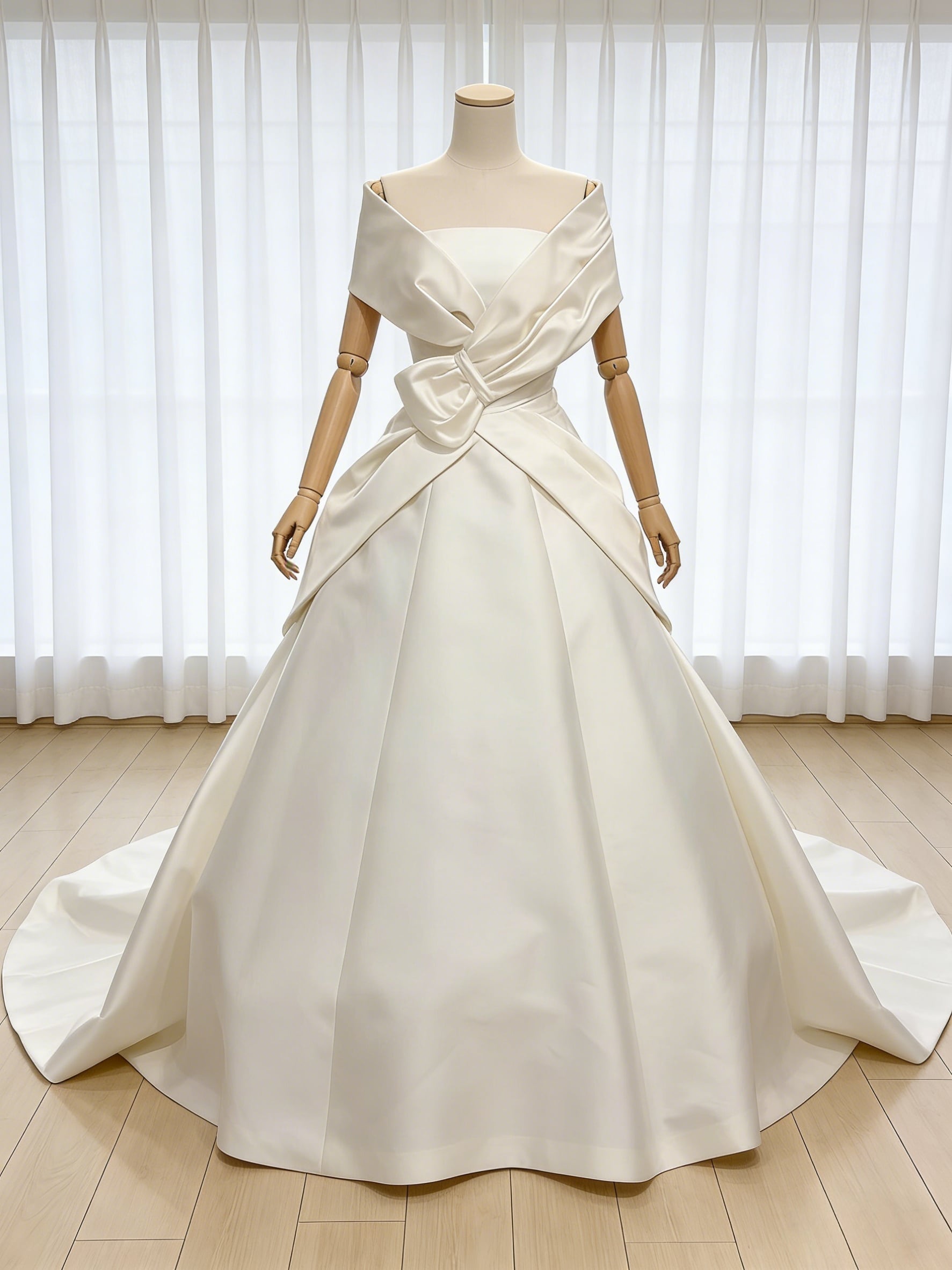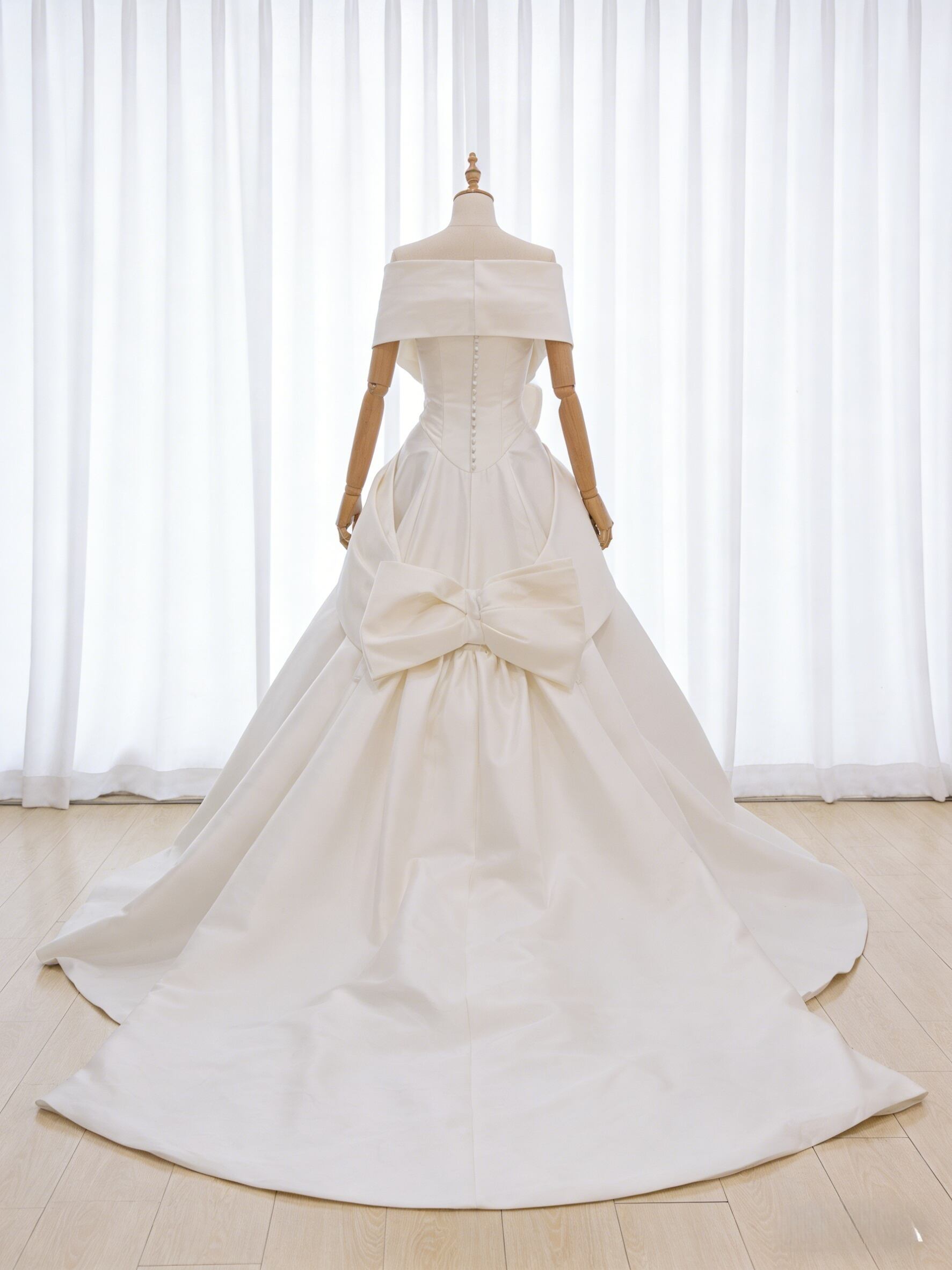 上品!オフホワイト オフショルダー エディングドレス ふっくら柔らかなバックリボン 結婚式/披露宴
