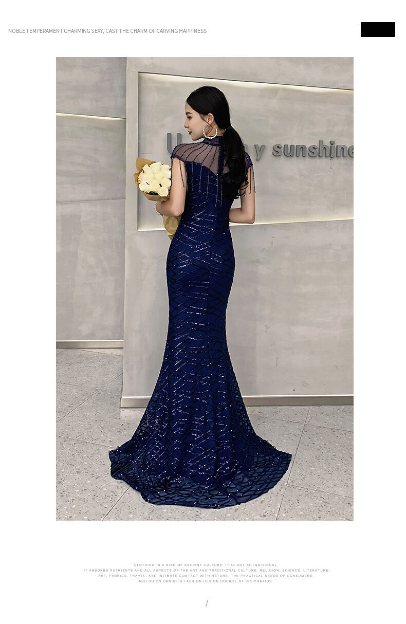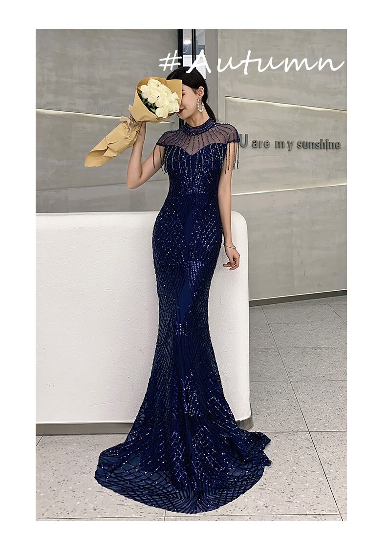 高品質! パーティードレス 青/ブルー スパンコール生地 マーメイドライン トレーン