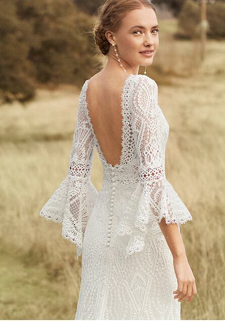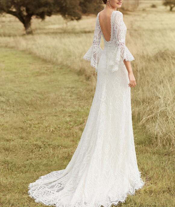 上品! ウエディングドレス 3D立体レース刺繍 短トレーン フレア袖