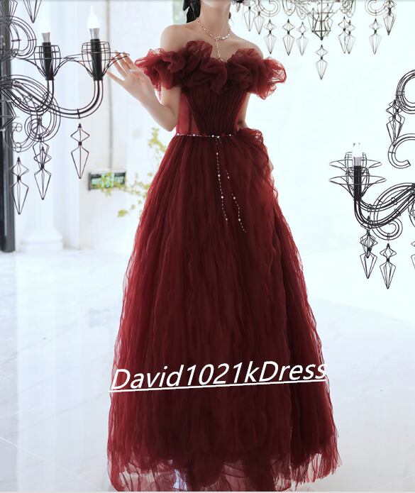 高品質! パーティードレス ワインレッド オフショルダー パール