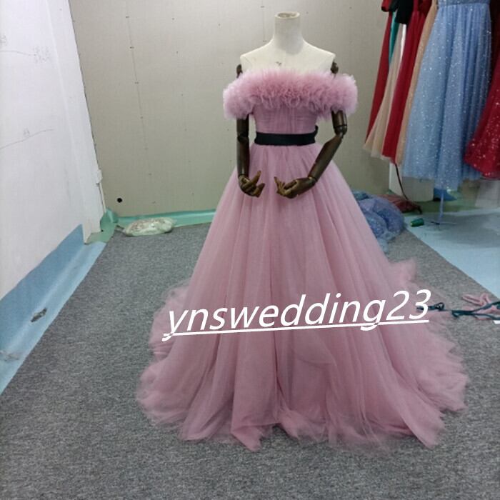 ピンクカラードレス オフショルダーの2WAYドレス ロングトレーン お色直し