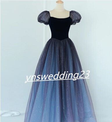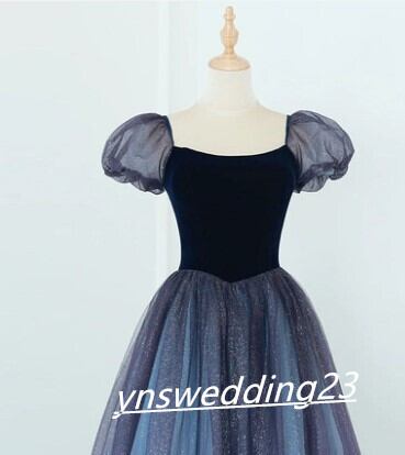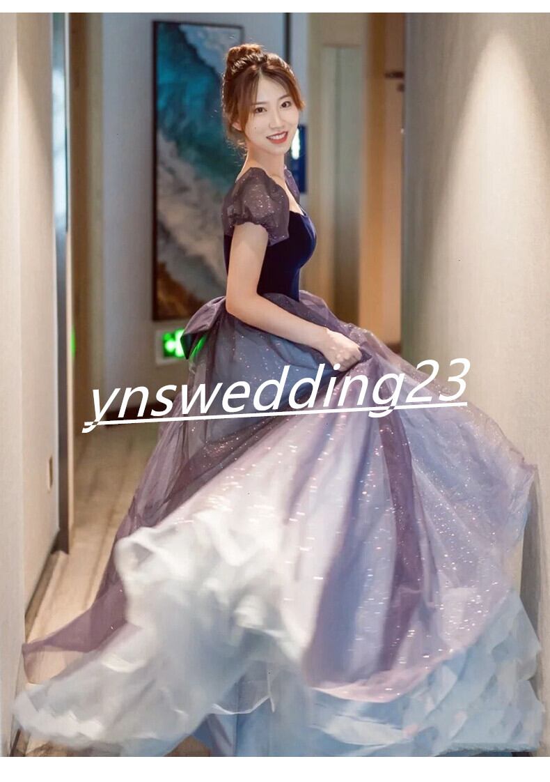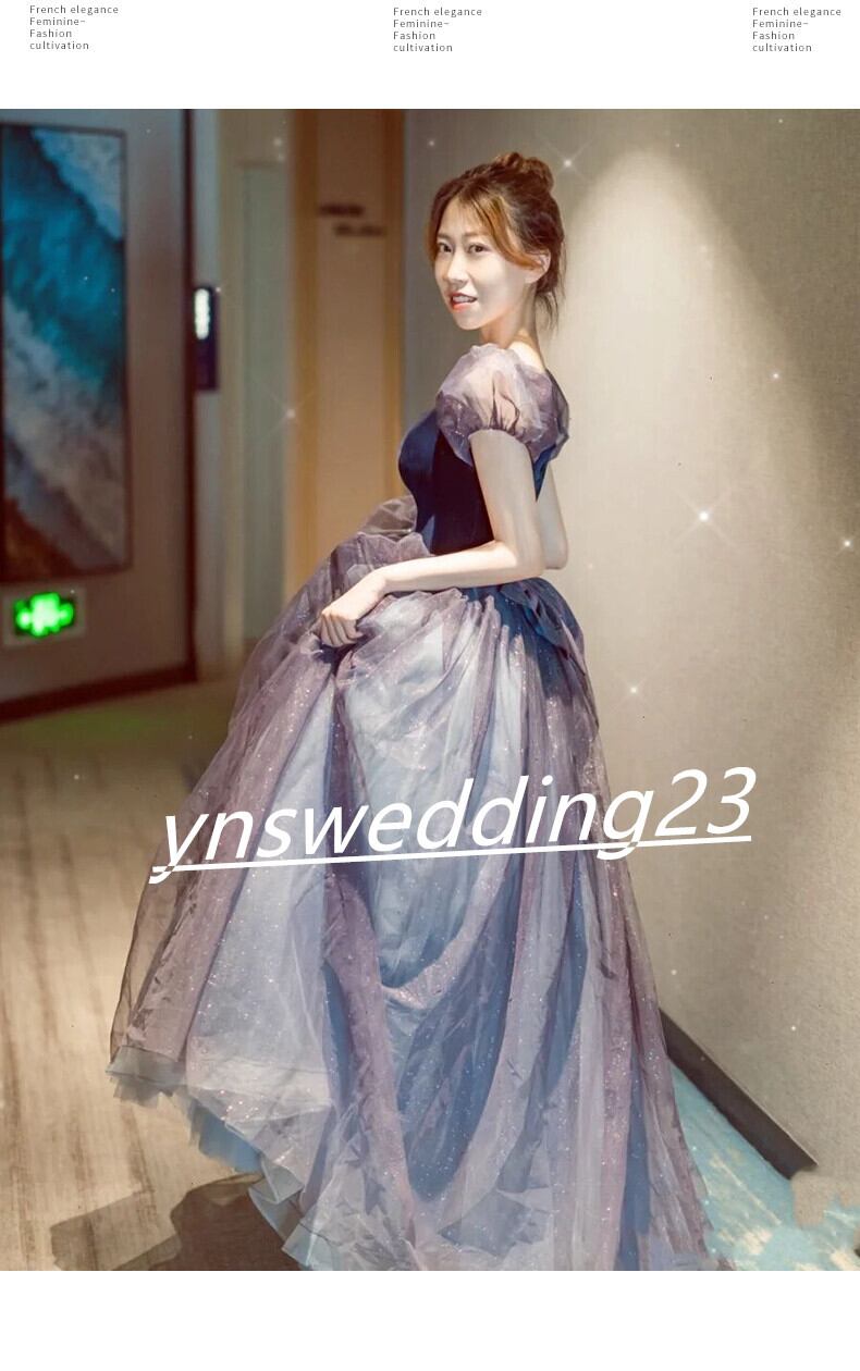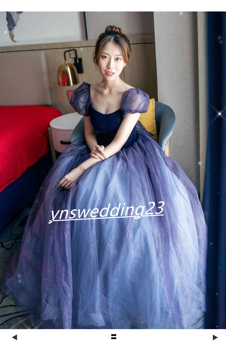 フランス風 パーティードレス 青/ブルー キラキラチュール パフスリーブ 2次会/合コン/デート