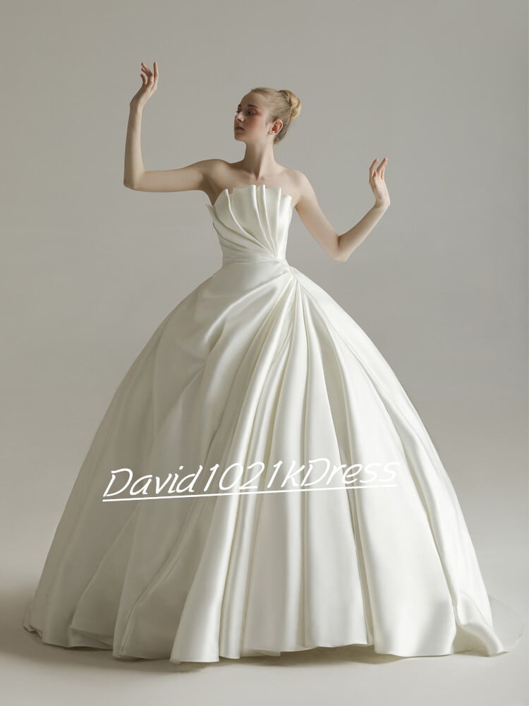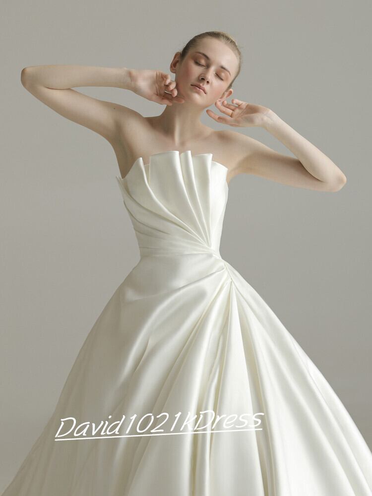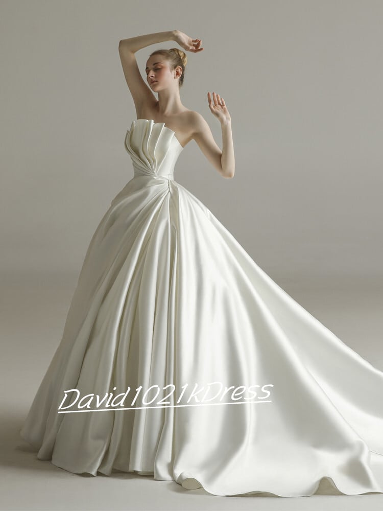 ウェディングドレス ホワイト 光沢サテン ベアトップ 結婚式/披露宴