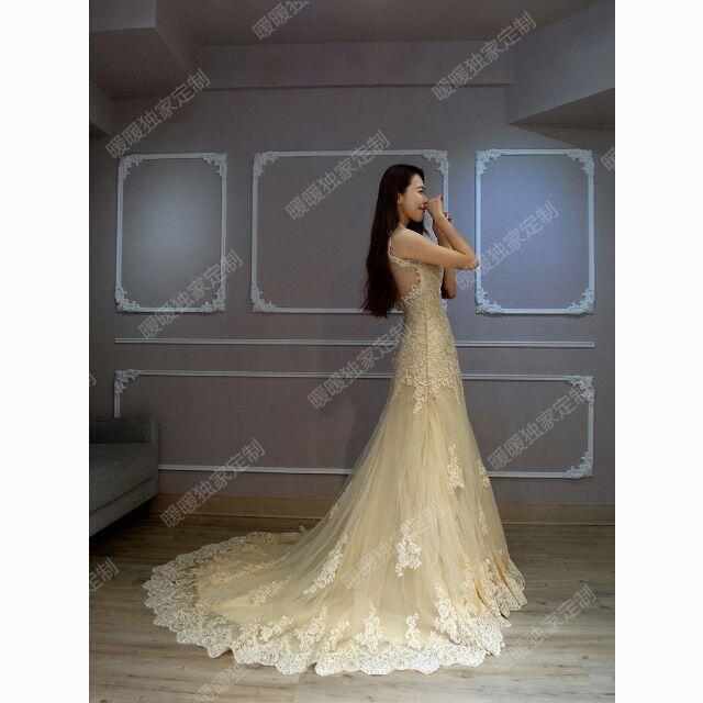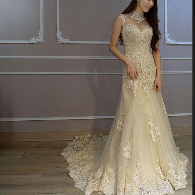 高品質! ウェディングドレス 薄シャンパンの色 3D立体レース刺繍