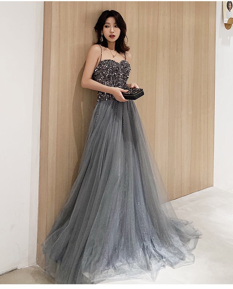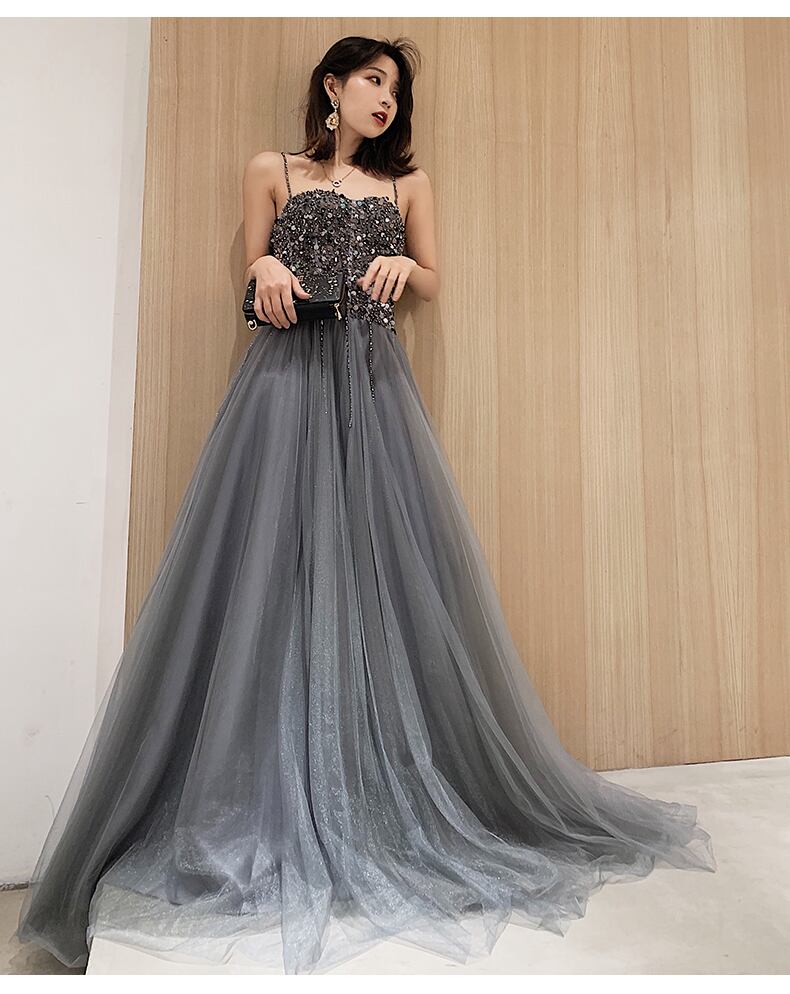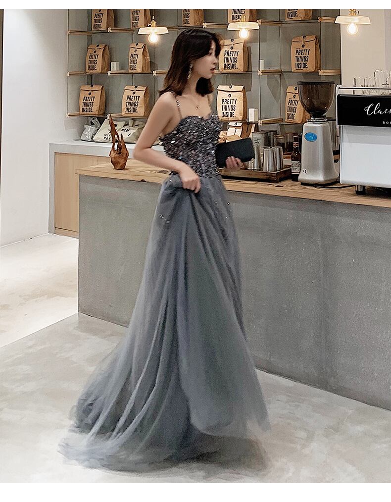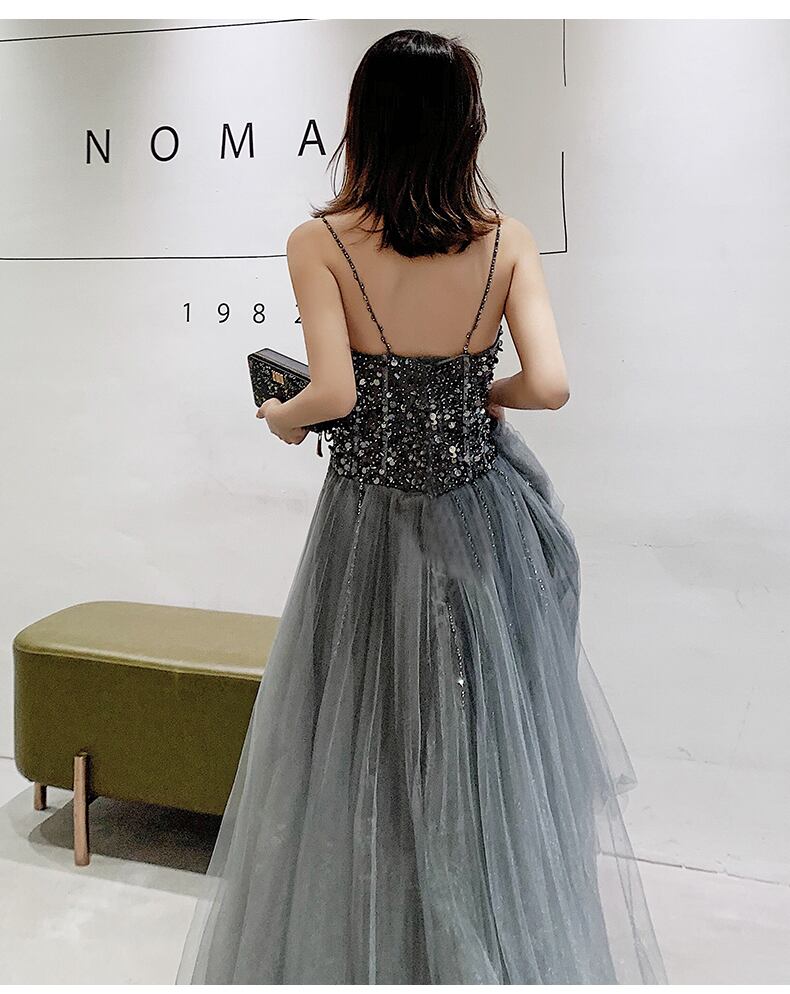 上品!パーティードレス グレーカラードレス キラキラチュール 背中見せ 謝恩会/ パーティー