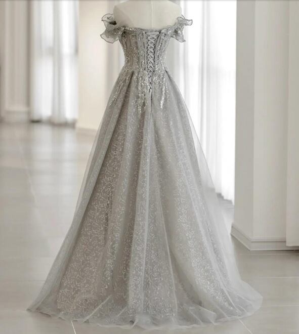 高品質! パーティードレス シルバー スパンコール生地 オフショルダー