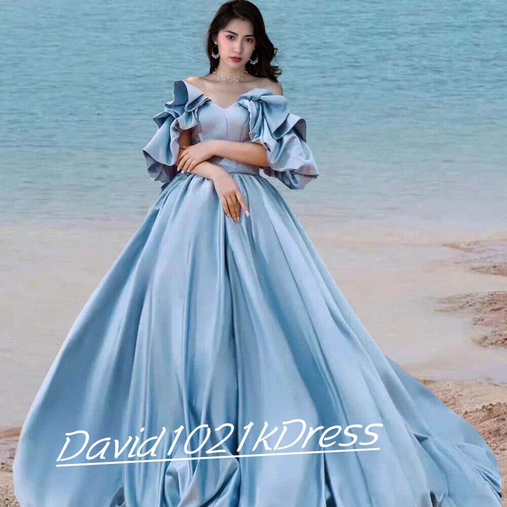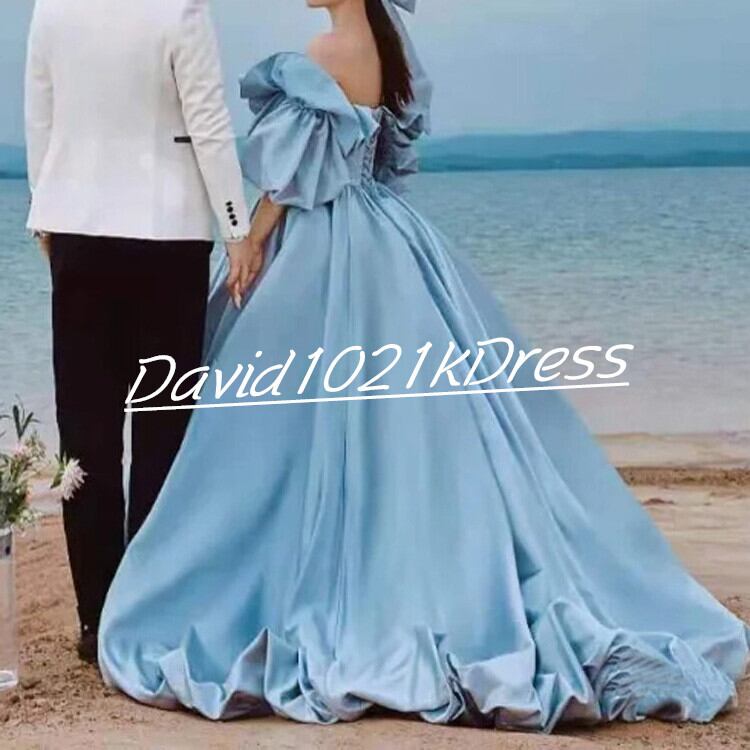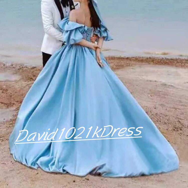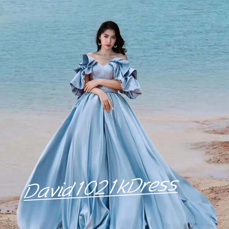 ヘプバーン風 ウエディングドレス ブルー オフショルダー ビーチ 前撮り