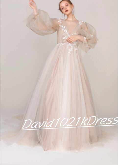 カラードレス シャンパン色 前撮り シースルー袖 小花レース 花嫁