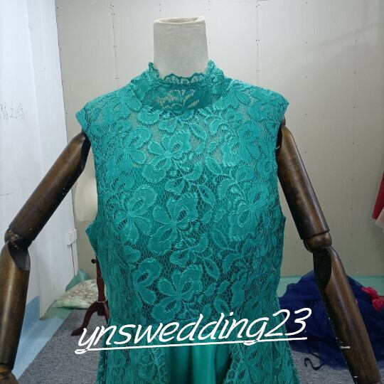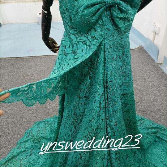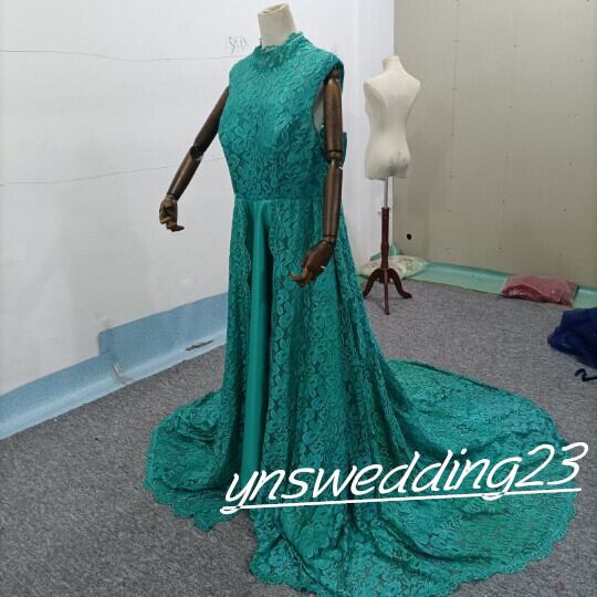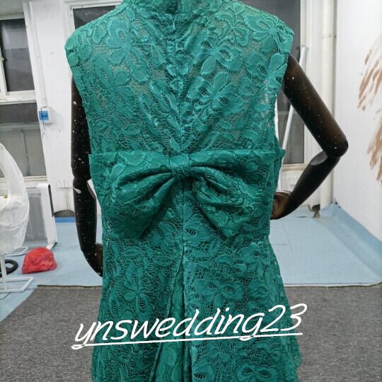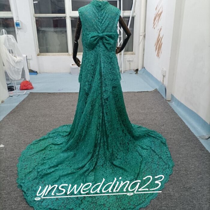 高品質! ウエディングドレス 绿色 サテン トレーン シースルー袖 リボン 総レース