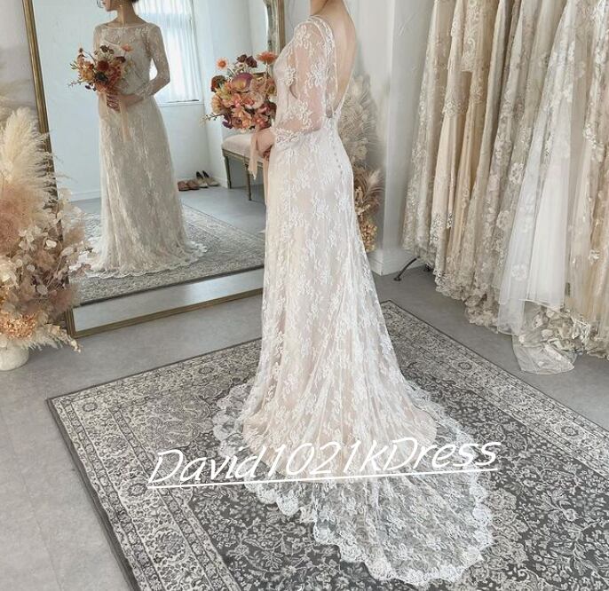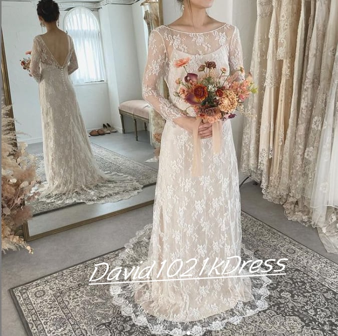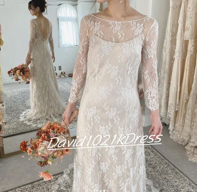 高品質! ウェディングドレス 薄シャンパンの色 総レース ロングスリーブ