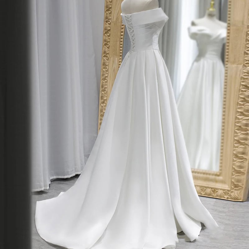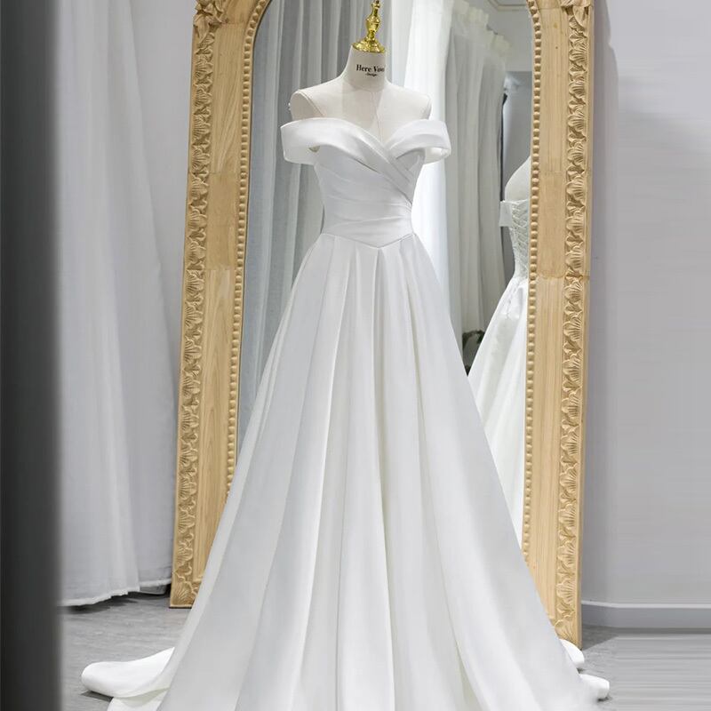 フランス風 ヘプバーン風 ウエディングドレス オフショルダー 短トレーン
