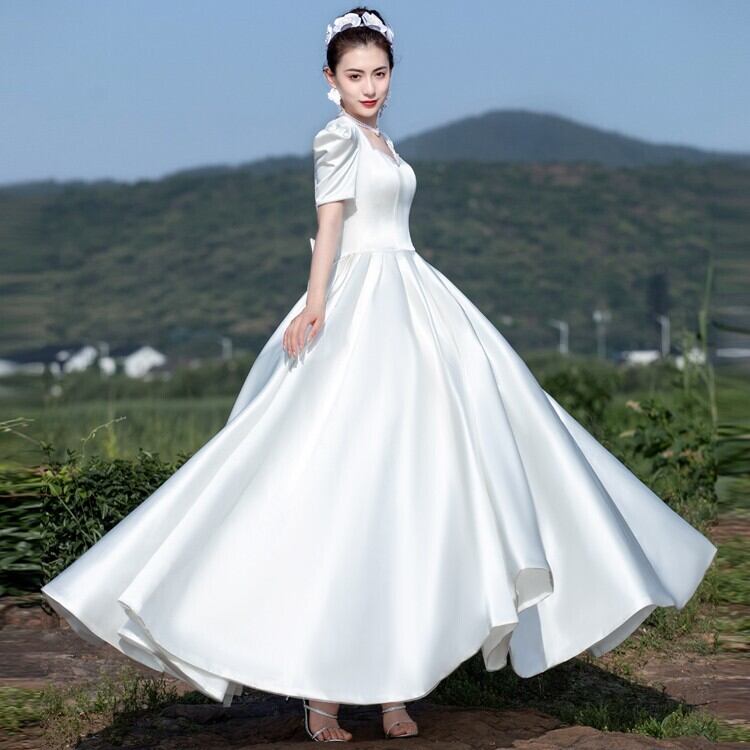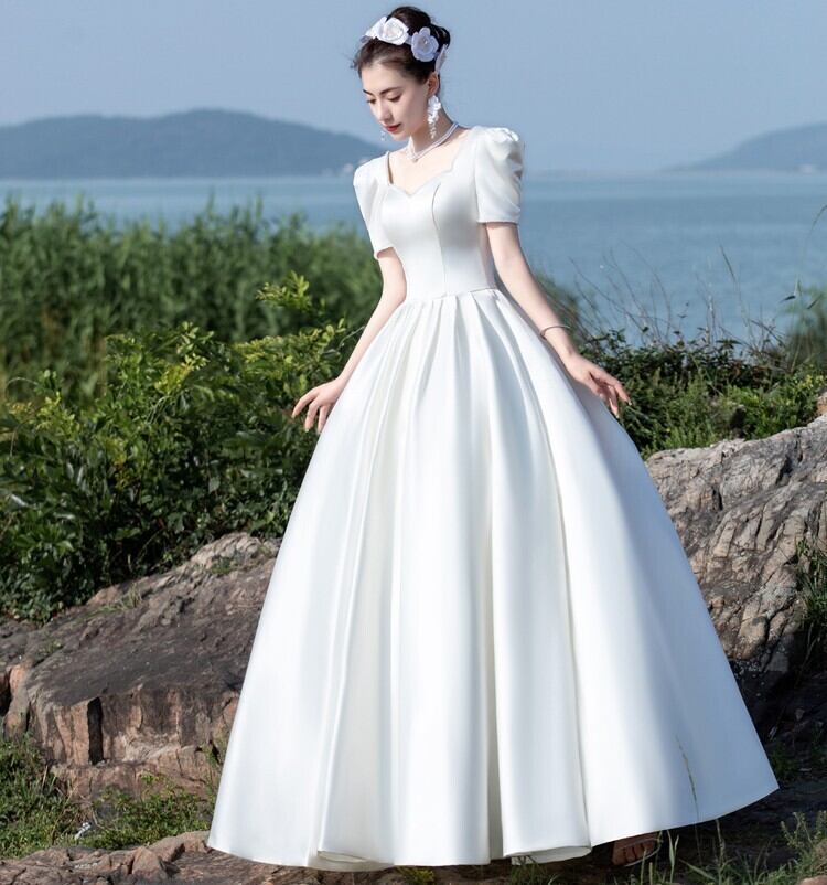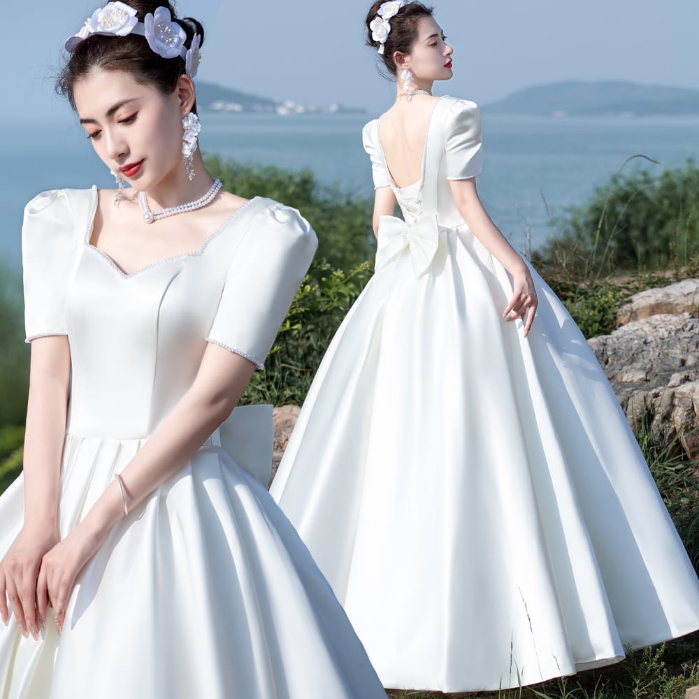 ウエディングドレス 光沢サテン ホワイト お呼ばれ/二次会 パフスリーブ