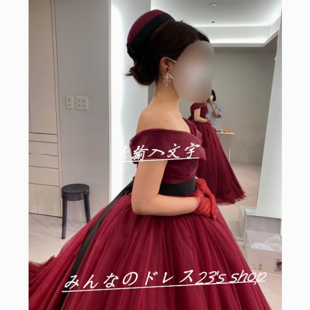 オフショルダー ウェディングドレス ボルドー色 ソフトチュール 披露宴