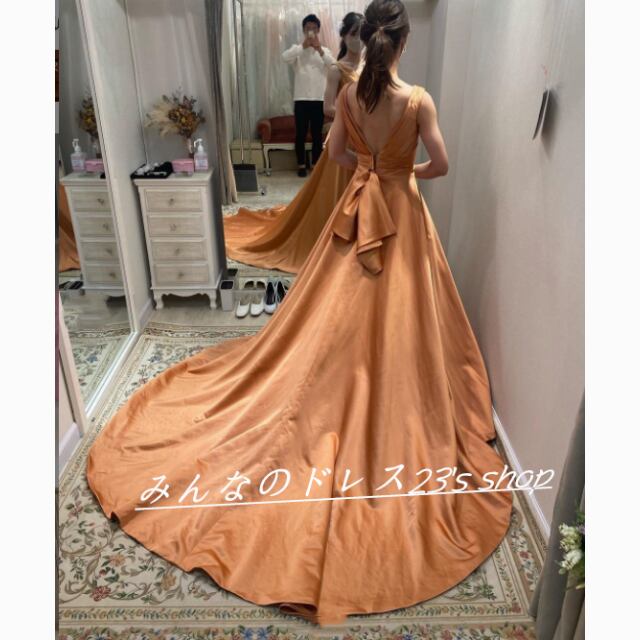 高品質! パーティードレス オレンジ 光沢サテン トレーン 2次会