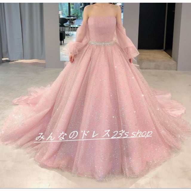 カラードレス ピンク キラキラチュール ラッフルフリル シースルー袖