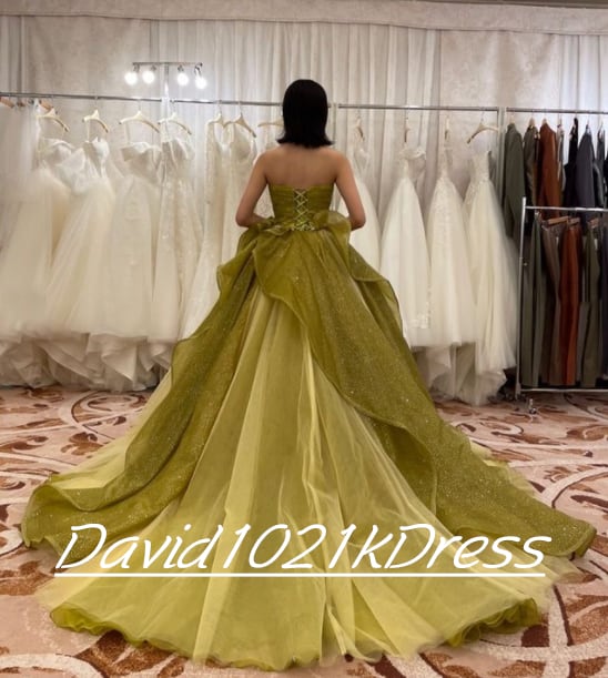 高品質! カラードレス 薄グリーン キラキラチュール 前撮り トレーン