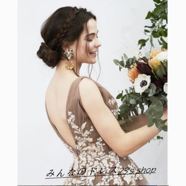 ウエディングドレス ブラウン 3D立体レース刺繍 背中見せ 2次会