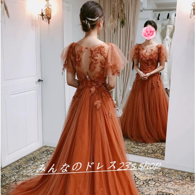高品質! パーティードレス テラコッタ色 3D立体レース刺繍 2次会