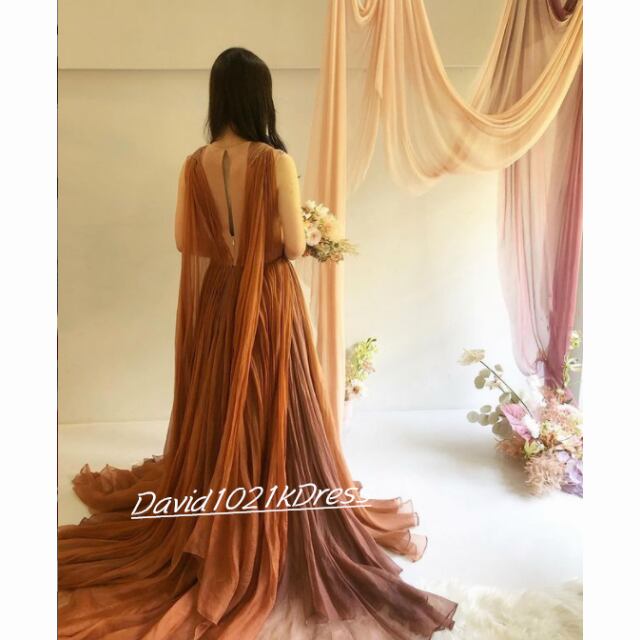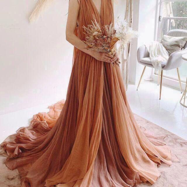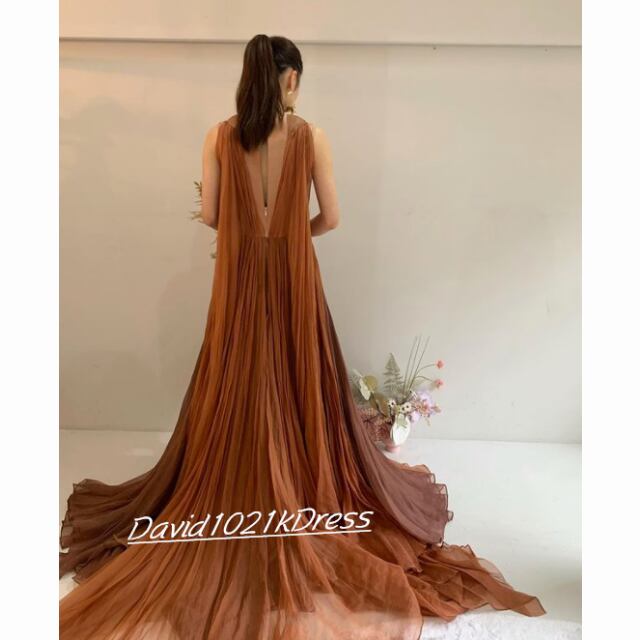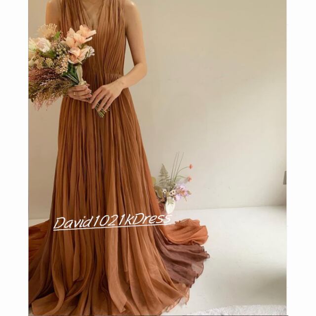 カラードレス テラコッタ色 Vネックドレス ソフトチュール トレンド人気