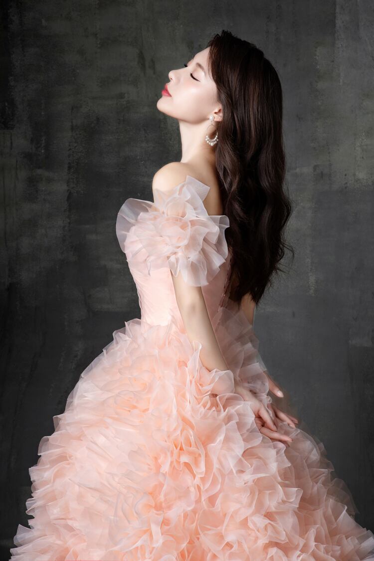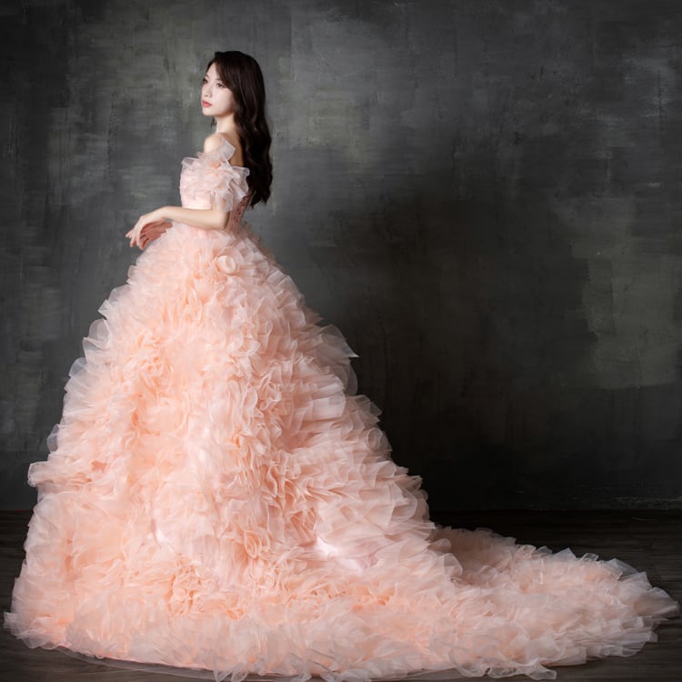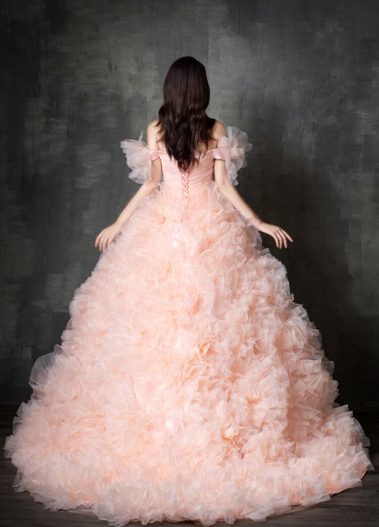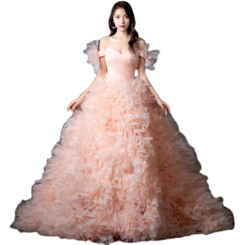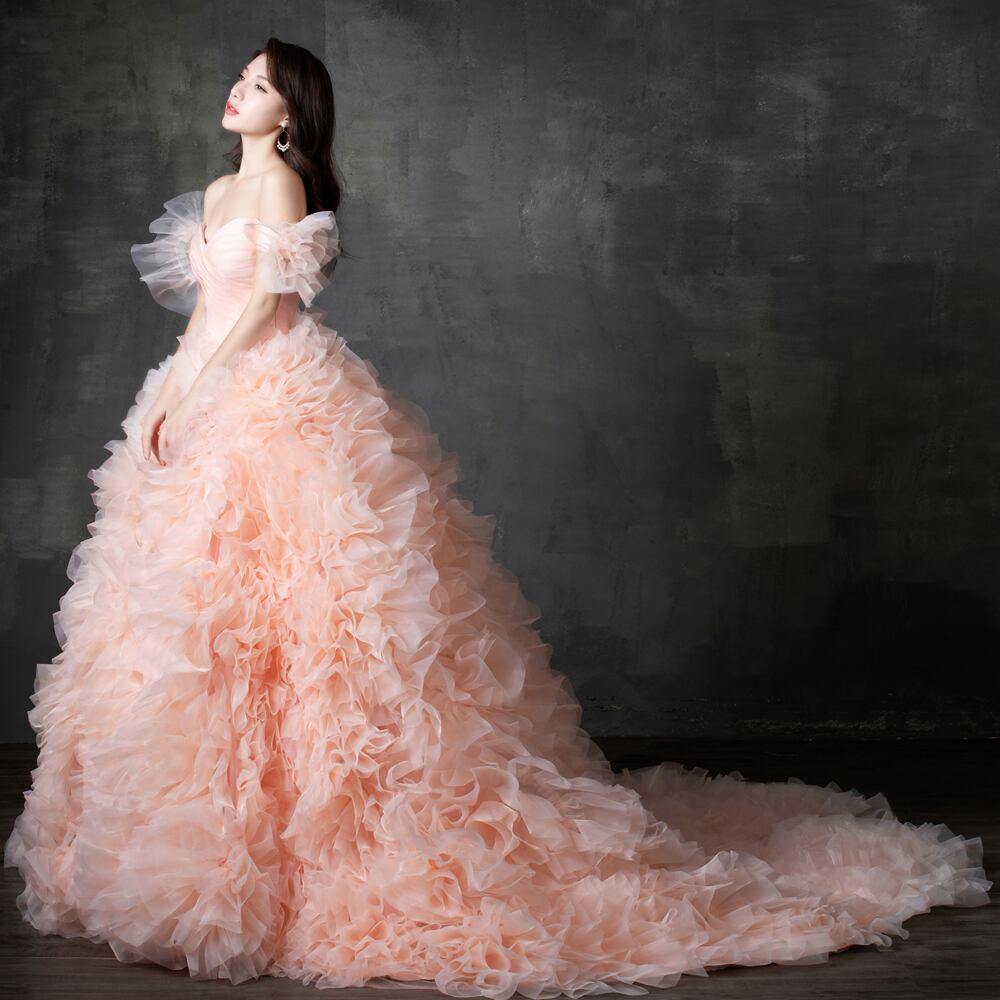 カラードレス ピンク 写真撮影 ソフトチュール 羽ドレス トレーン 結婚式/披露宴 演奏会/音楽会/発表会