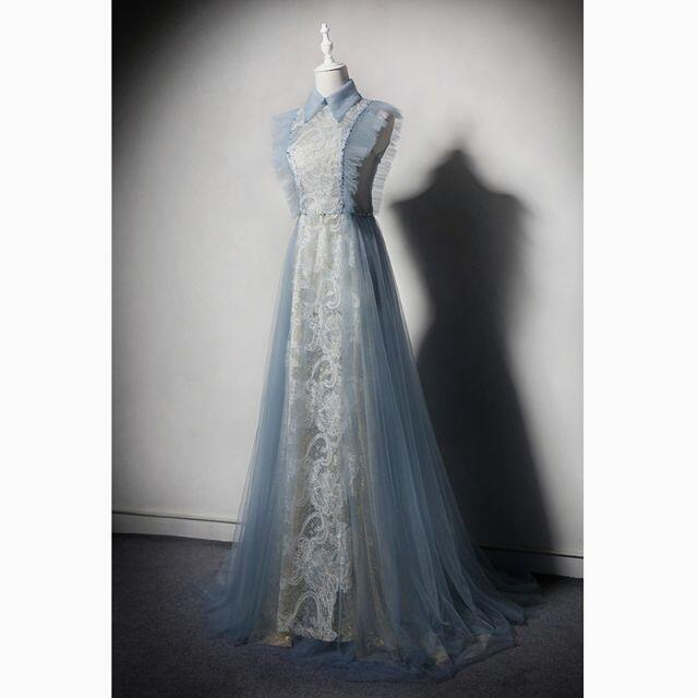 エレガント パーティードレス 青/ブルー 3D立体レース刺繍 2次会