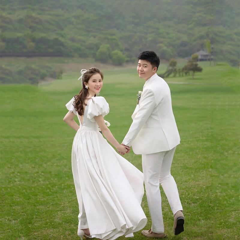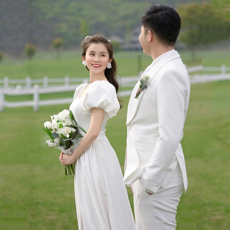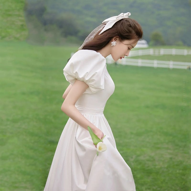 フランス風 ウエディングドレス ホワイト 背中見せ パフスリーブ 結婚式/披露宴