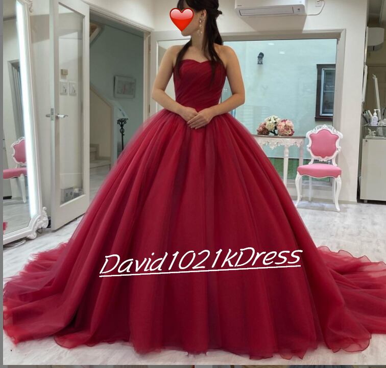 ボルドー色 カラードレス ソフトチュール ベアトップ 結婚式/披露宴
