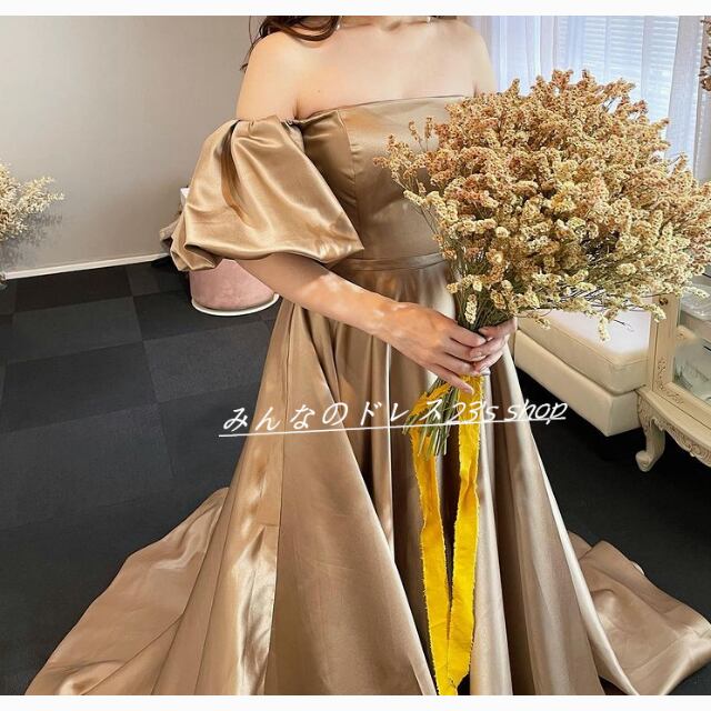 エレガント カラードレス ベアトップ パフスリーブ トレーン
