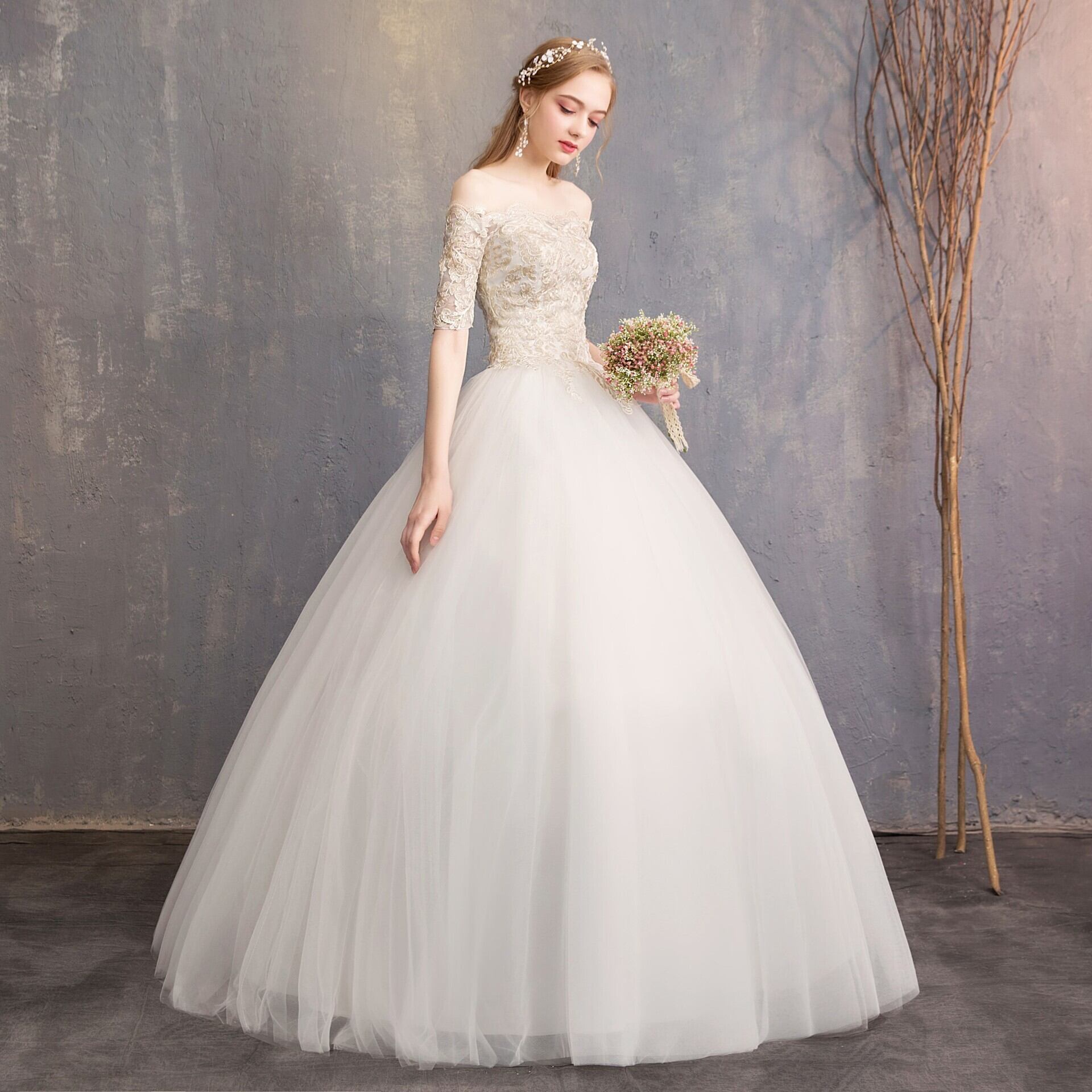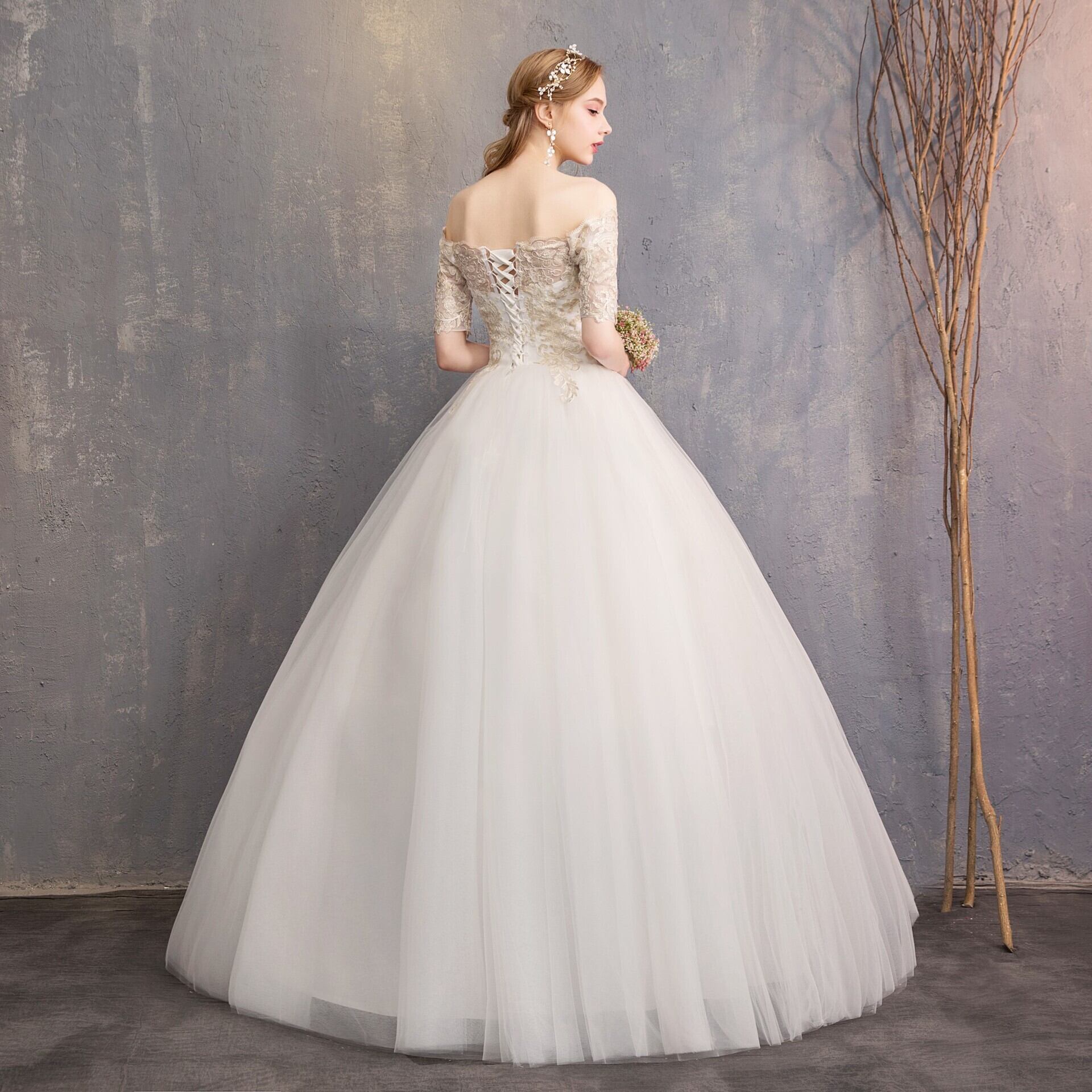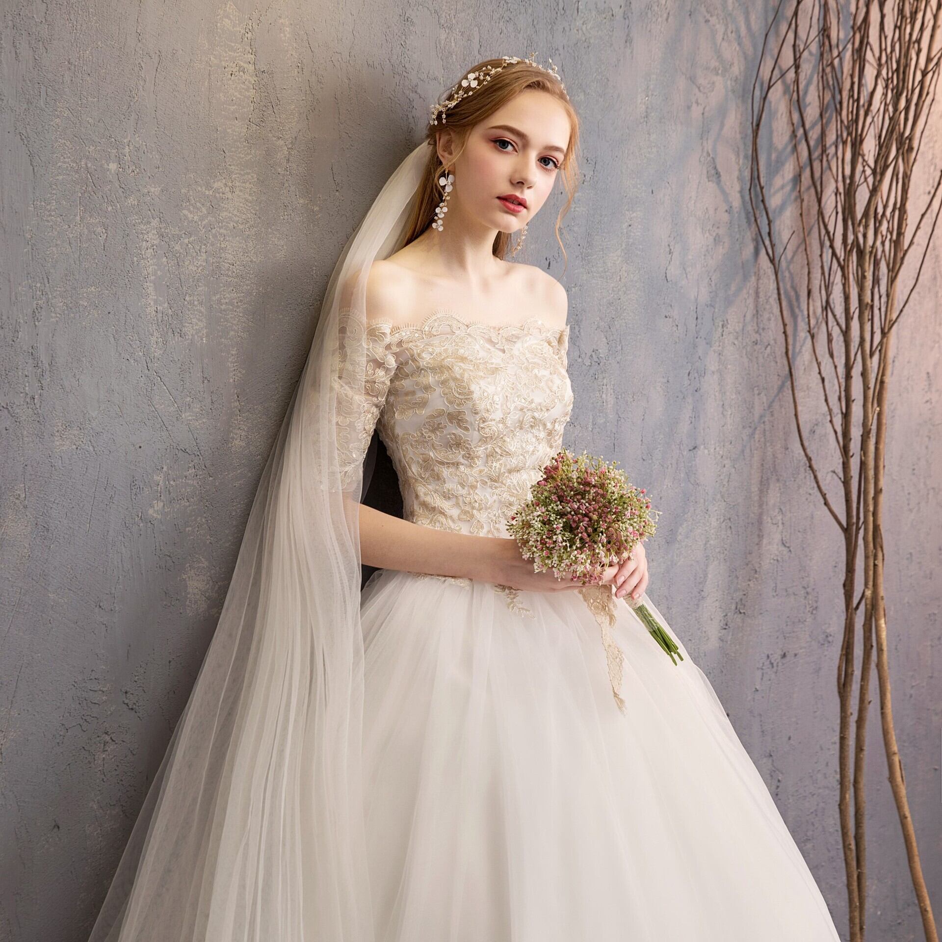 上品! ウエディングドレス ソフトチュール オフショルダー 3D立体レース刺繍 花嫁