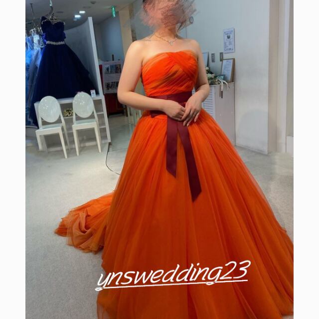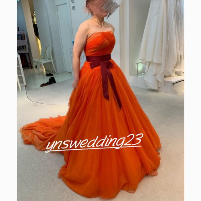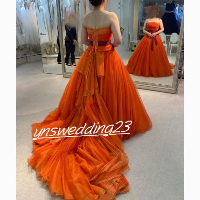 カラードレス オレンジ ソフトチュール ロングトレーン 結婚式
