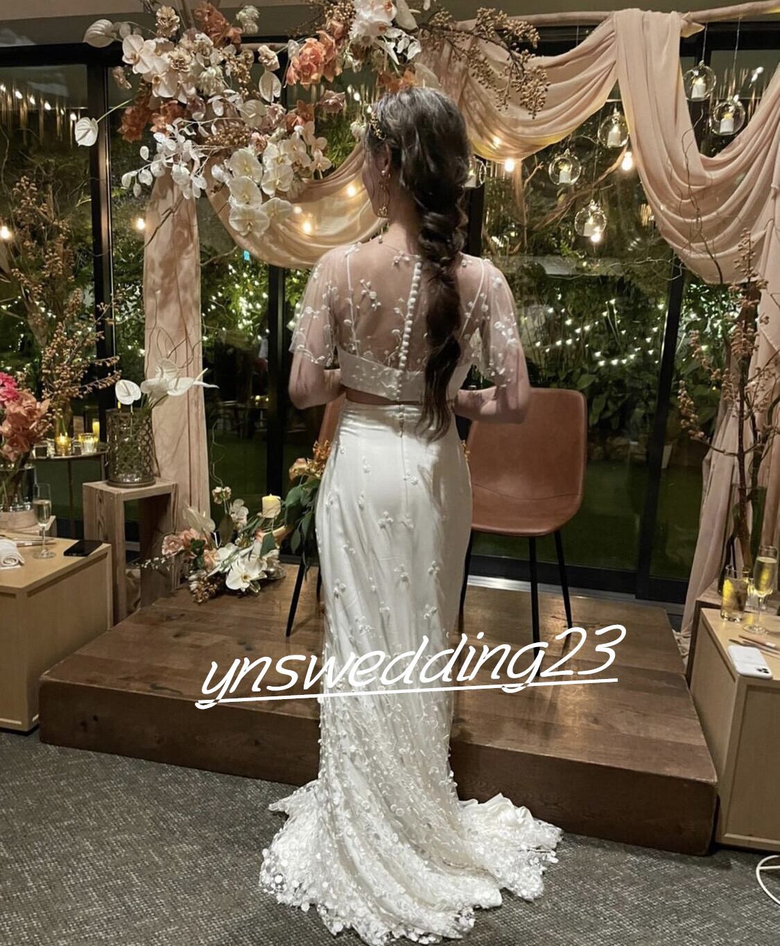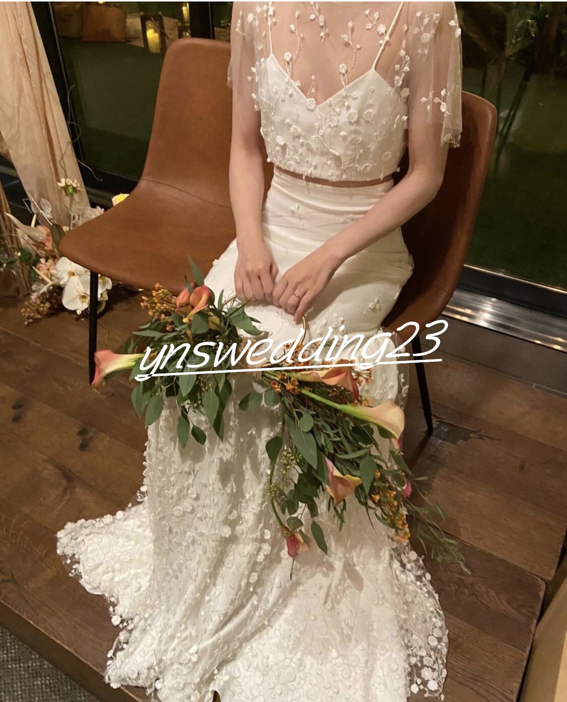 ウエディングドレス 二次会ドレス 3D立体レース刺繍 トップス+スカート 前撮り 花嫁 二次会 セパレートドレス ツーピース