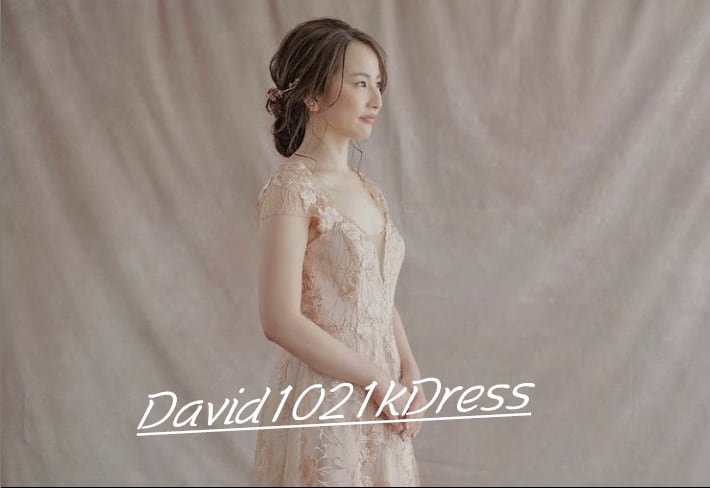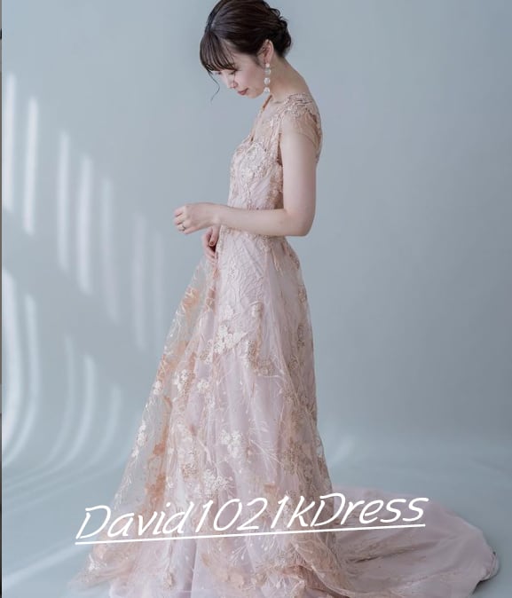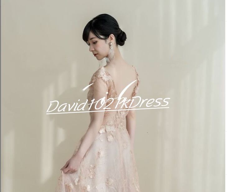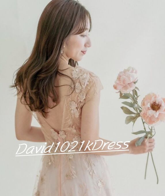 高品質! カラードレス アプリコットカラー 3D立体レース刺繍 セクシー 深Vネック