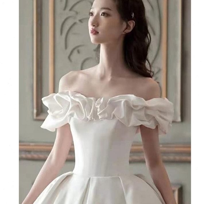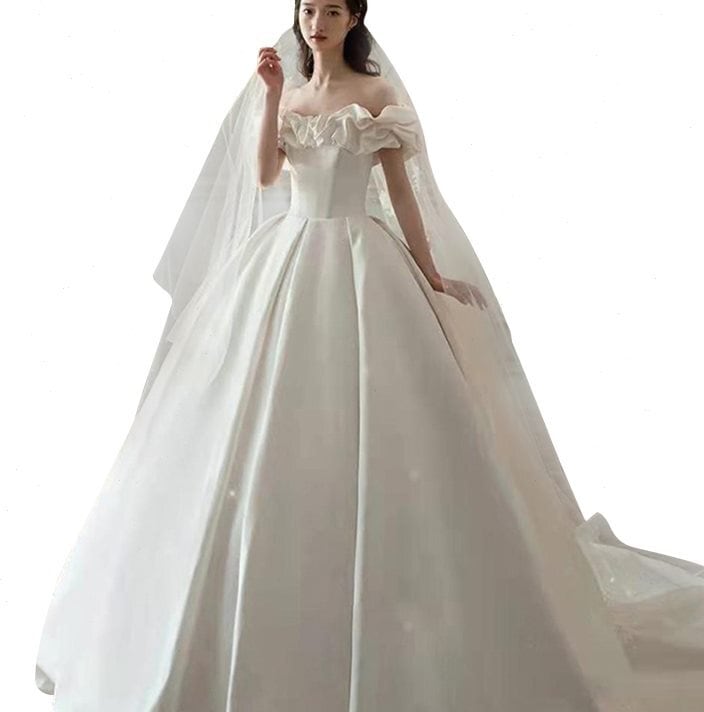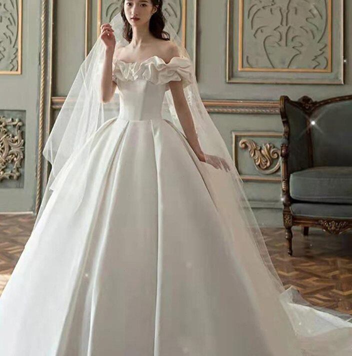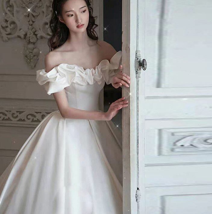 フランス風 ウエディングドレス ホワイト サテン オフショルダー 結婚式/披露宴