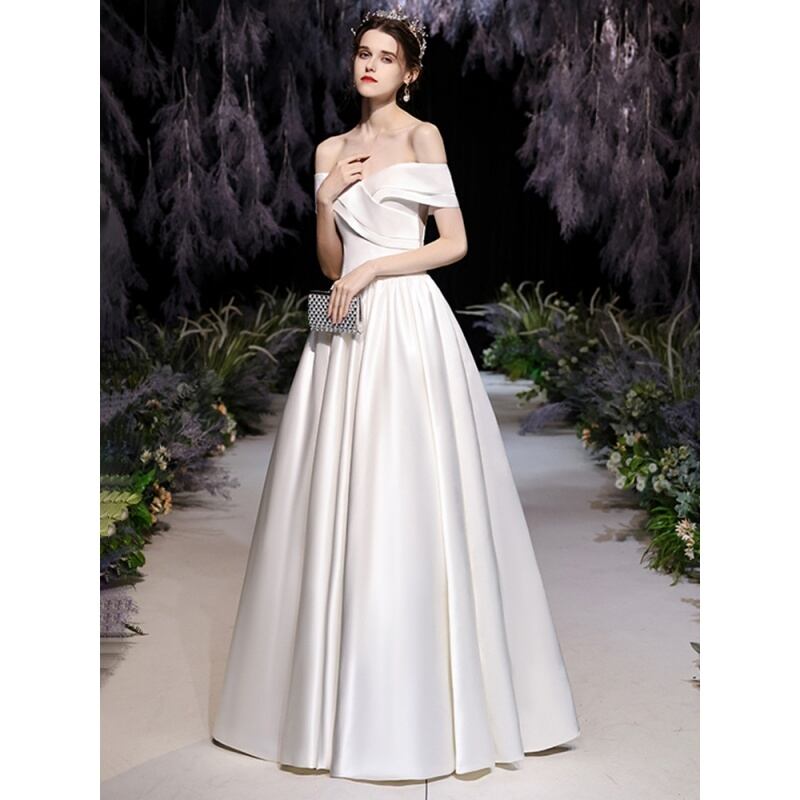 ヘプバーン風 ウエディングドレス 光沢サテン オフショルダー 2次会