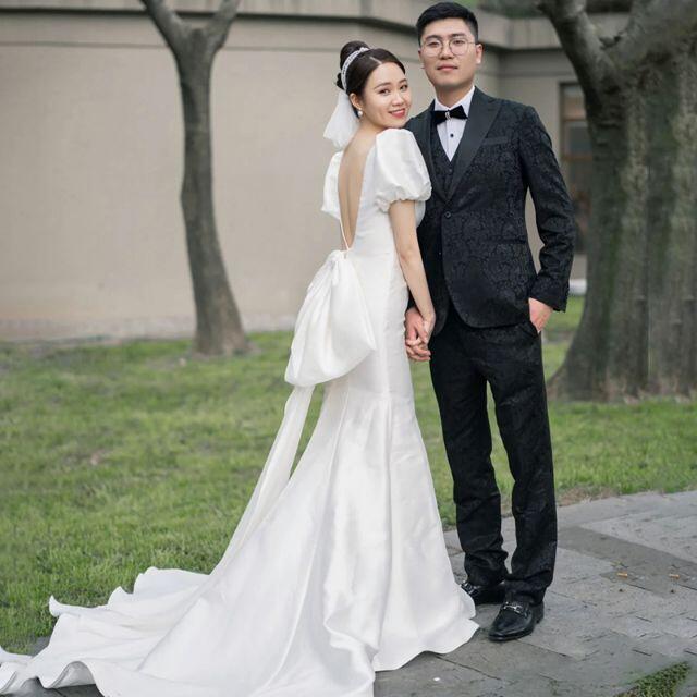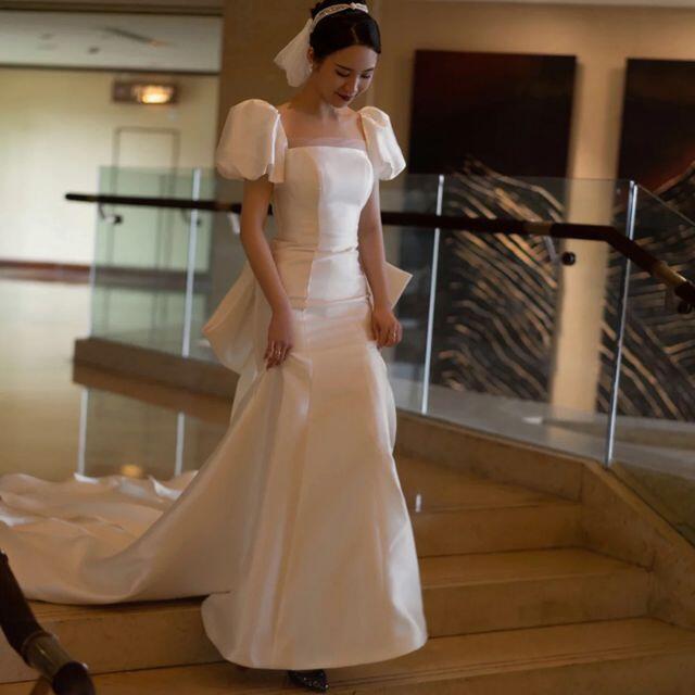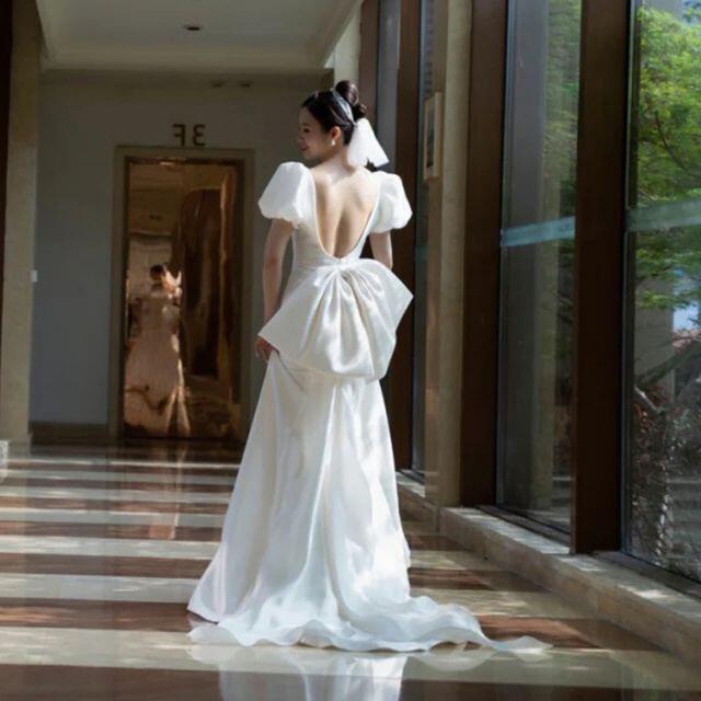 フランス風 ウェディングドレス サテン 背中見せ 大きなリボン