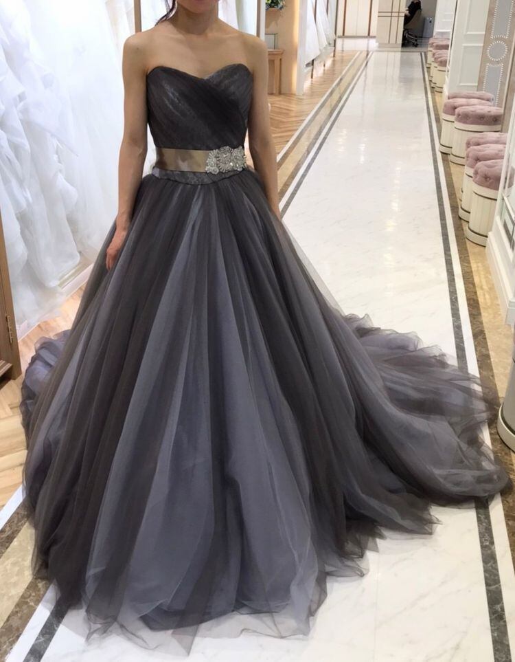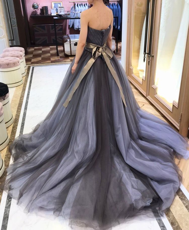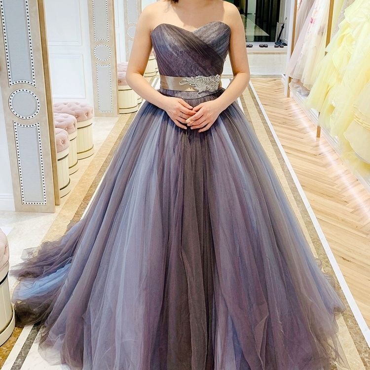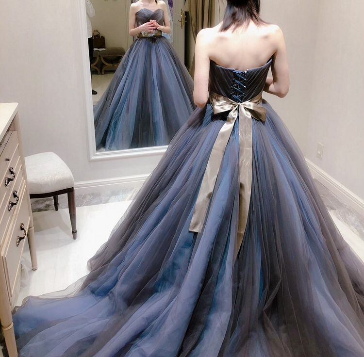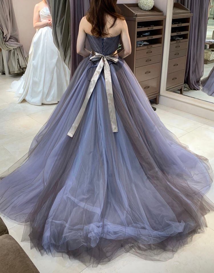 カラードレス ブルーグレー ソフトチュール ベアトップ 結婚式 パーティードレス ダンスドレス