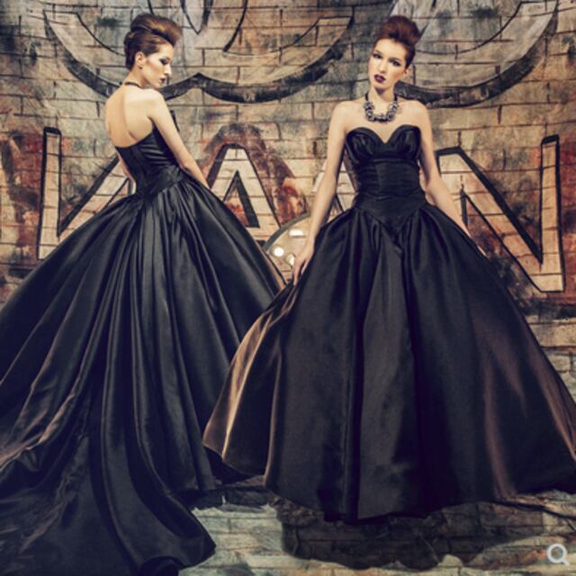 憧れのウエディングドレス 黑 光沢サテン ベアトップ トレーン 教会式