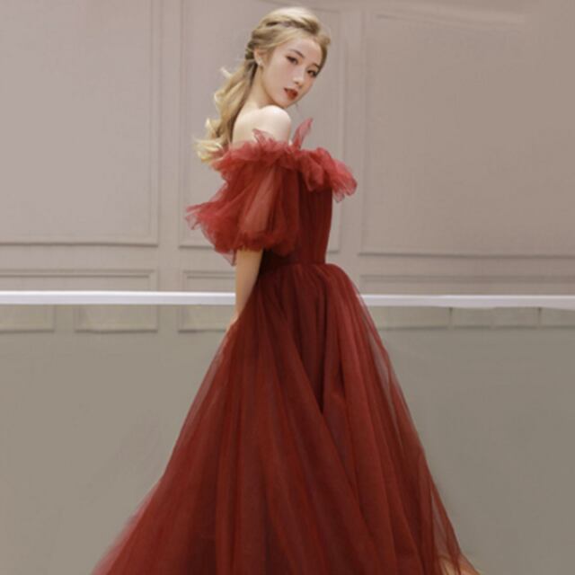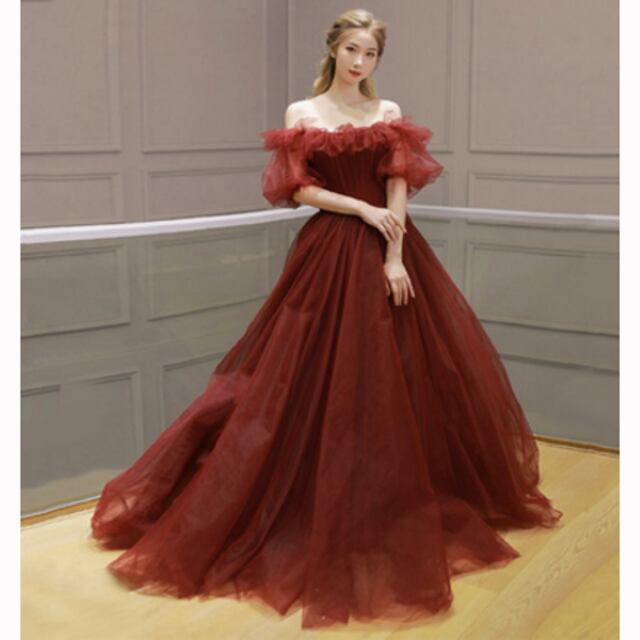 ボルドー色 カラードレス オフショルダー ソフトチュール 結婚式ドレス
