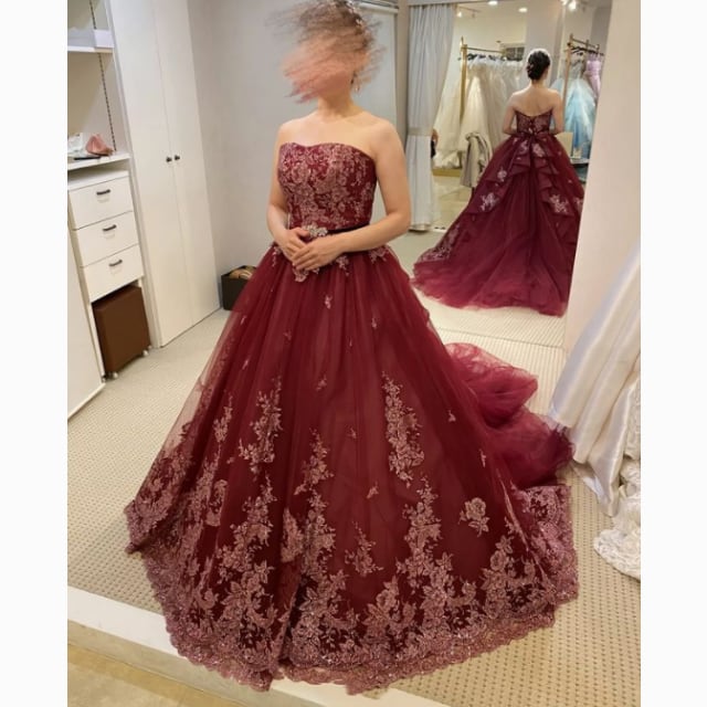 ボルドー色 ウエディングドレス 3D立体レース刺繍 ベアトップ 花嫁