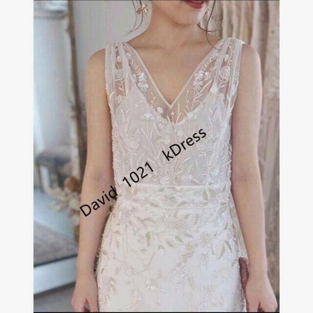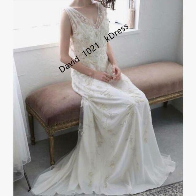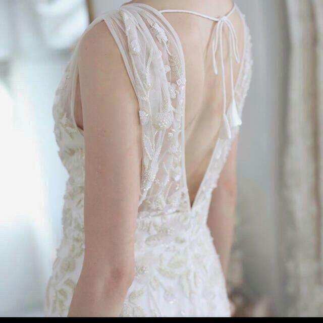 高品質! ウエディングドレス 3D立体レース刺繍 パール 深Vネック