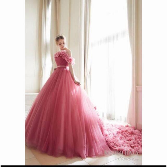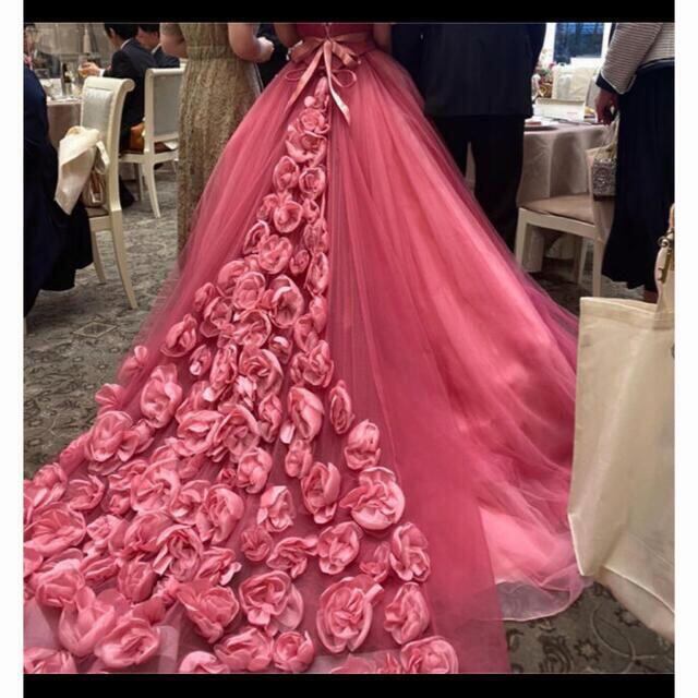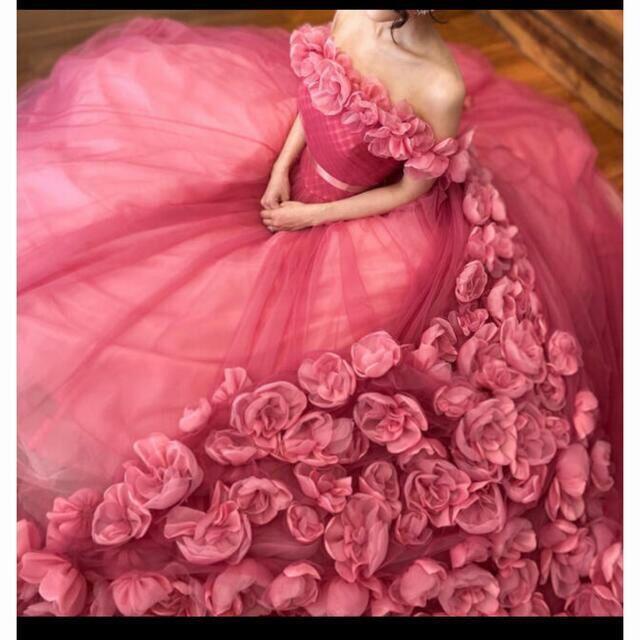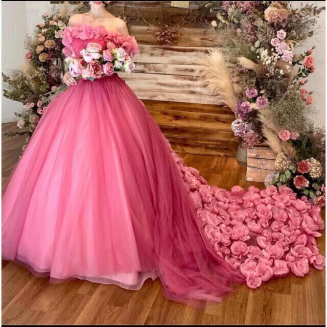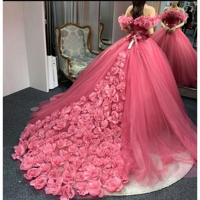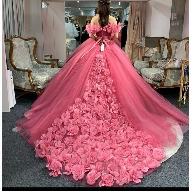 高品質!ウエディングドレス ローズピンク 3Dバラの花 フラワードレス オフショルダー カラードレス パーティードレス 結婚式/披露宴