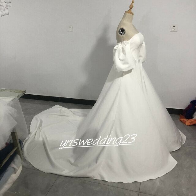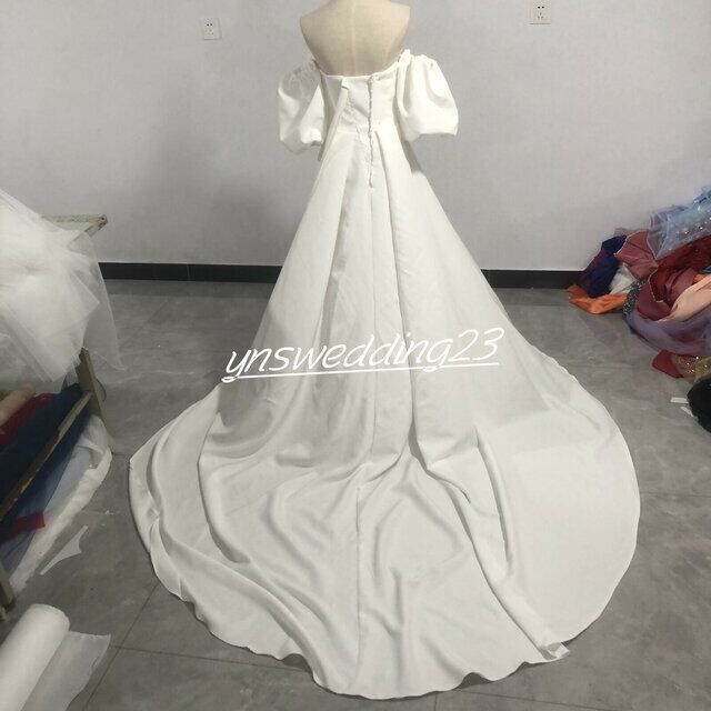 人気上昇 オフショル ホワイト パーティードレス 二次会 前撮り 挙式 パフスリーブ マット生地 ウエディングドレス