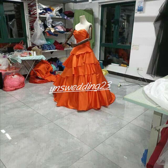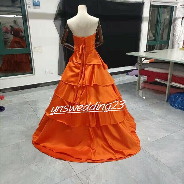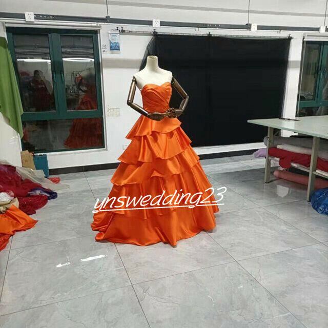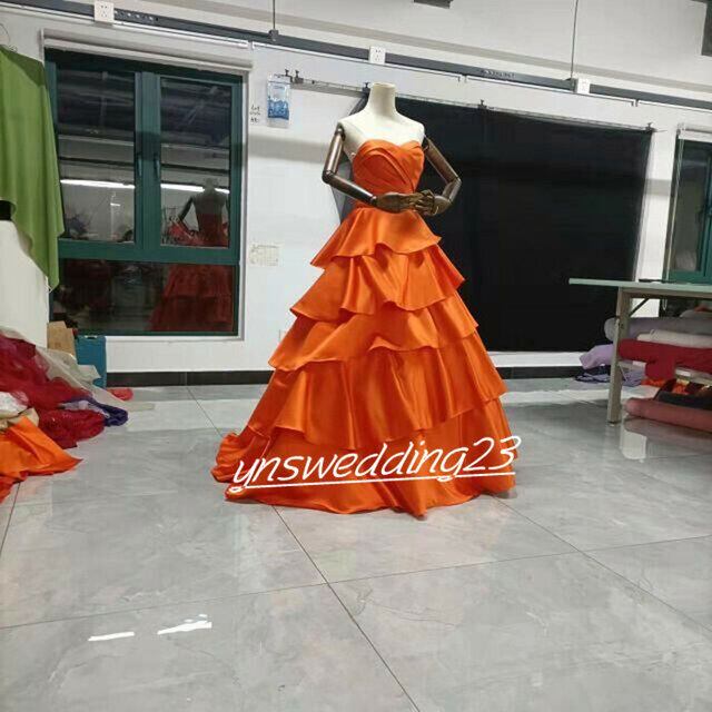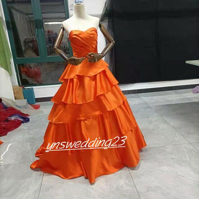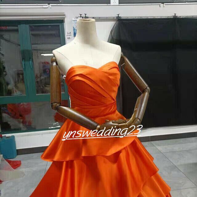 高品質! カラードレス オレンジ 光沢サテン ベアトップ 舞台ドレス 2次会