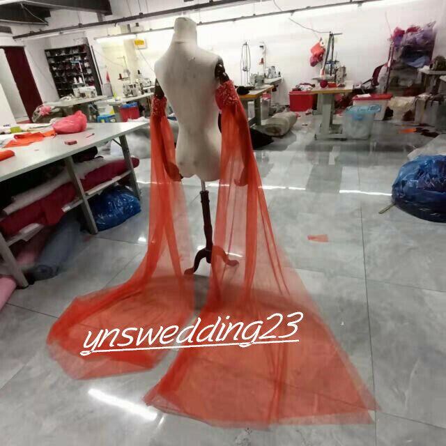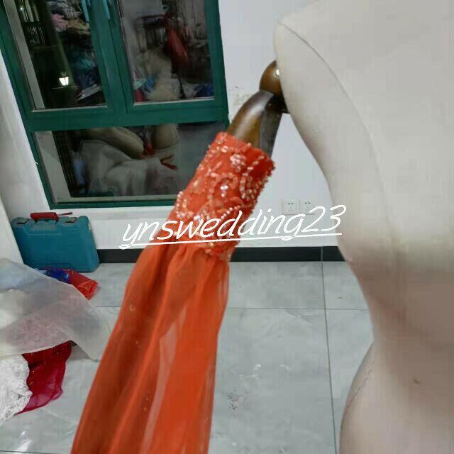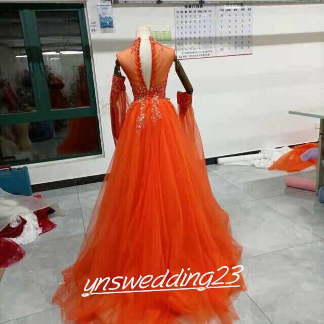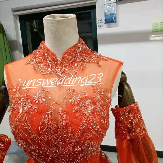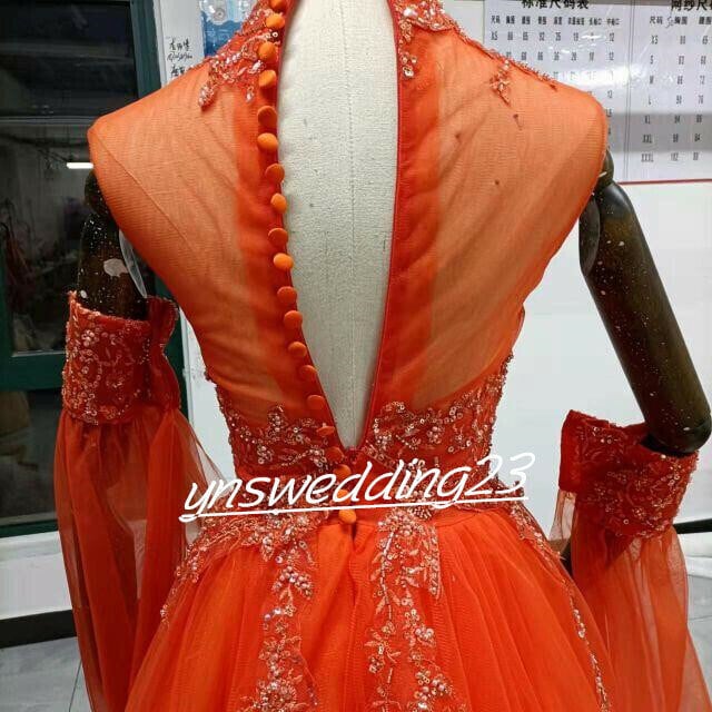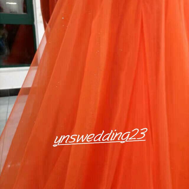 高品質! ウェディングドレス オレンジ 3D立体レース刺繍 キラキラチュール 取り外し袖 結婚式